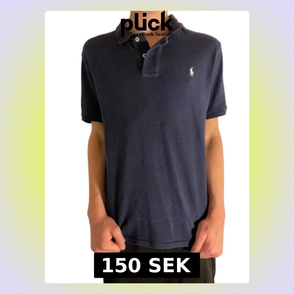 Säljer en mörkblå polo piké från Ralph Lauren med klassisk krage och två knappar framtill. T-shirten har korta ärmar och den ikoniska broderade loggan på bröstet. Materialet är mjuk bomull som känns skön mot huden.