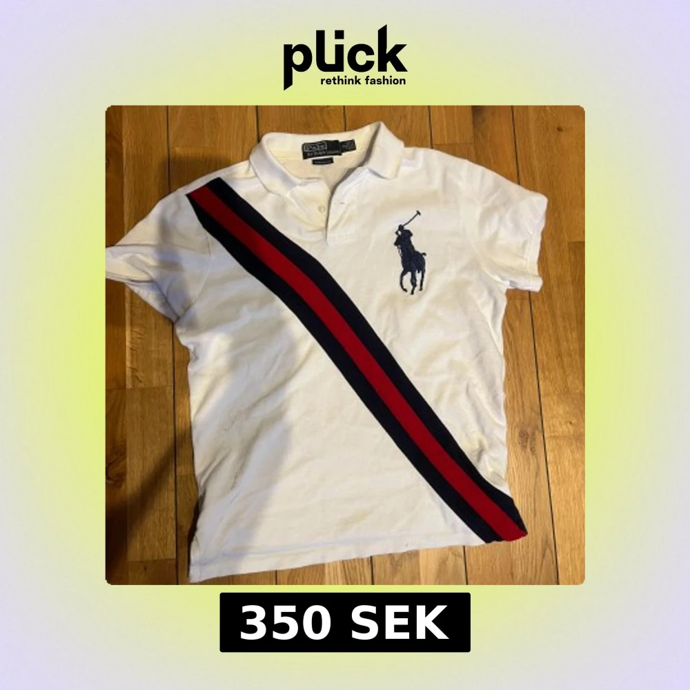 Snygg vit pikétröja från Ralph Lauren med korta ärmar och klassisk krage. Tröjan har ett stort blått broderat logotypmotiv och diagonala ränder i rött och blått. Perfekt för en stilren look! Stolen S