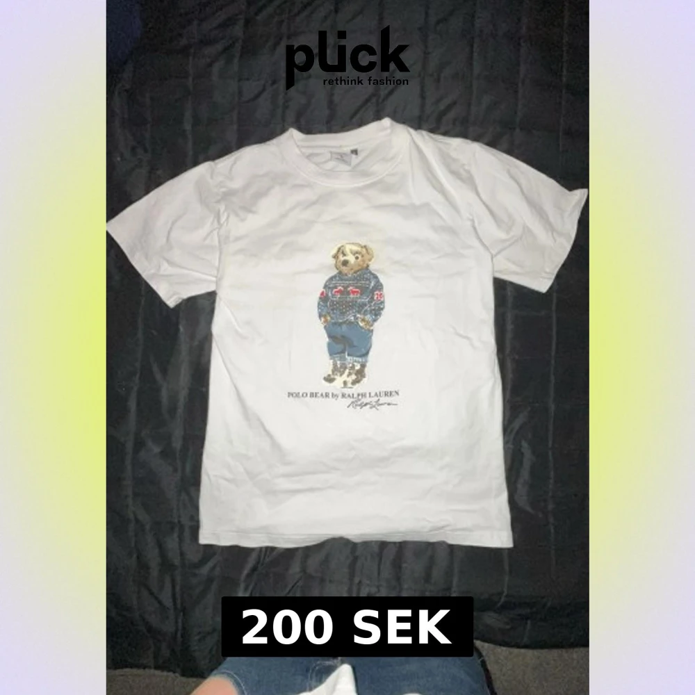 Vit t-shirt från Ralph Lauren med ikoniskt Polo Bear-tryck på bröstet. Björnen har en stickad tröja med rött och blått mönster, jeans och boots. T-shirten har rund hals och korta ärmar, tillverkad i mjuk bomull. Perfekt för dig som gillar klassisk streetstyle.