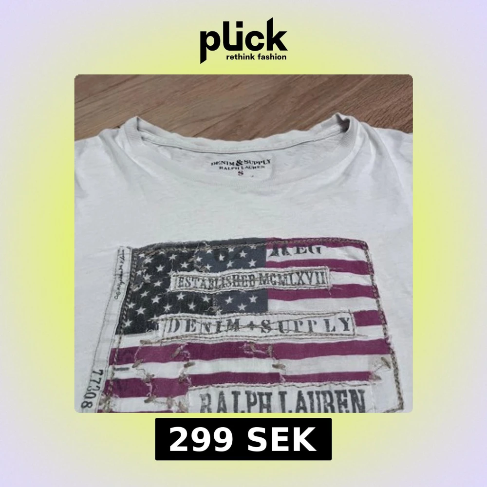 En schysst Ralph Lauren T-shirt med ett skrovligt tyg tryck. Står S, men passar som en Medium. Helt okej skick, varsitt litet ihopsydd hål under armhålorna som inte syns. Nypris 1199, men jag säljer den lite billigare pga defekterna.