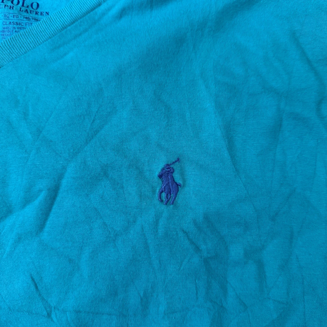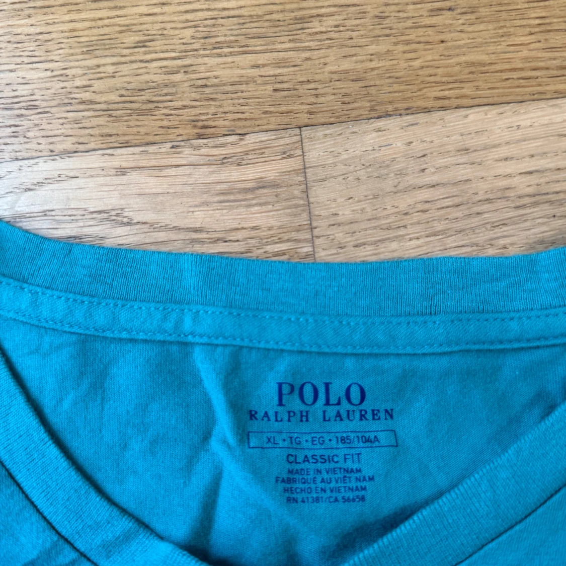 Turkos t-shirt från Polo Ralph Lauren med klassisk v-ringning och broderad logga på bröstet. Skön bomullskvalitet och normal passform, perfekt till jeans eller shorts. Enkel och stilren design som funkar året runt.