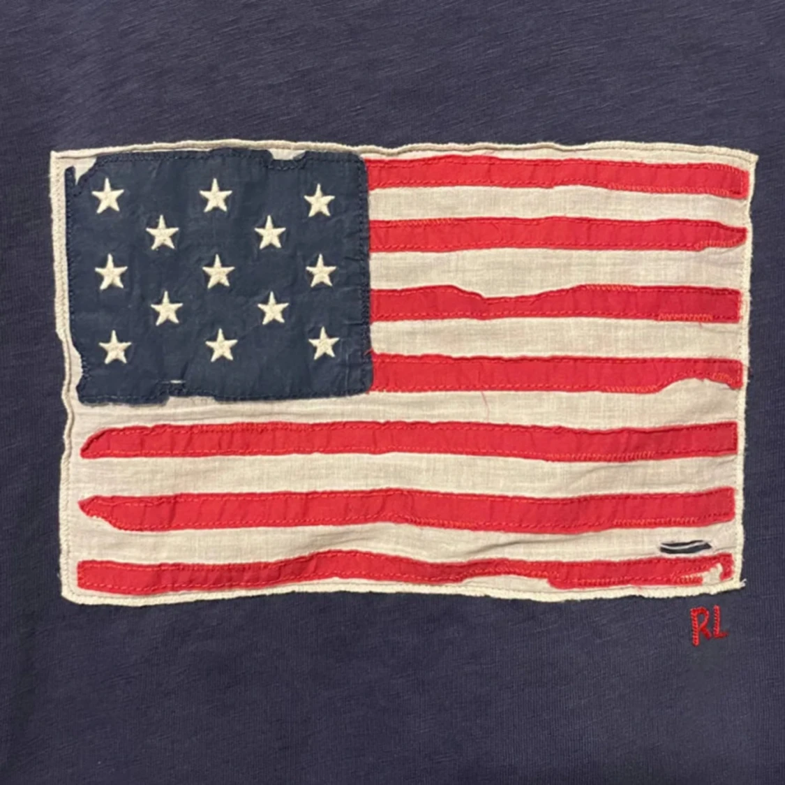 Snygg mörkblå t-shirt från Polo med en stor amerikansk flagga på bröstet. Flaggan har en vintage-look med broderade detaljer och RL-logga. Perfekt för en avslappnad stil.