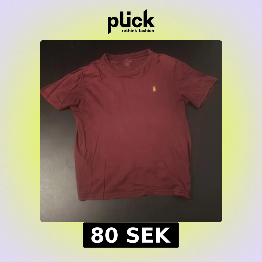 En vinröd t-shirt från Polo Ralph Lauren. Man ser att produkten har använts ganska mycket, men inga tydliga defekter förekommer. 10-12 år