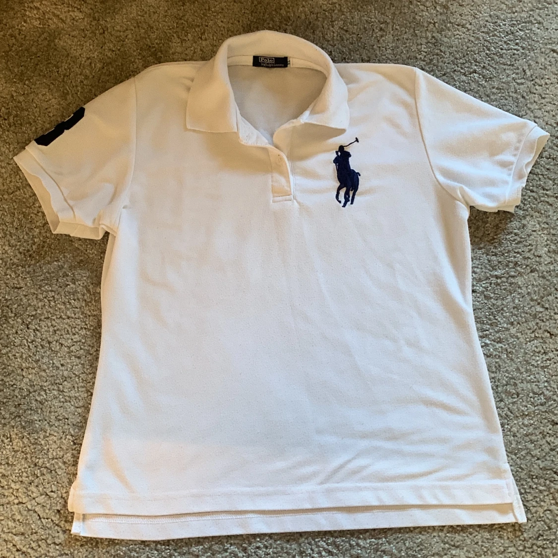 Kopia piké vit, skulle säga att det är stl S. Snygg till jeans!