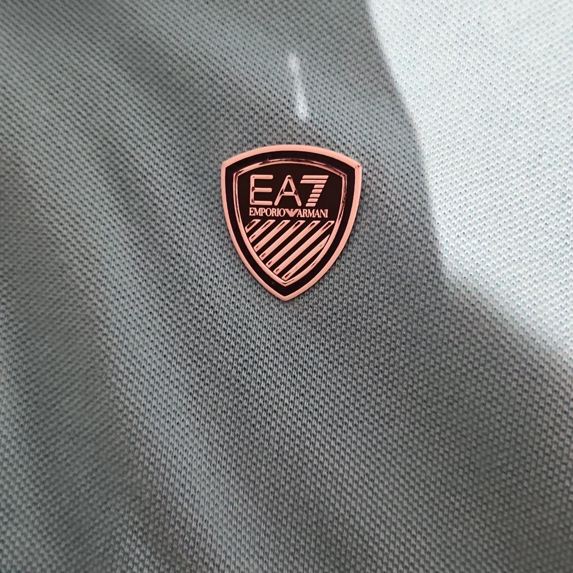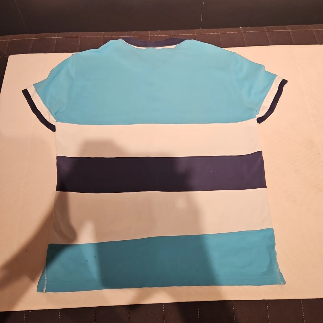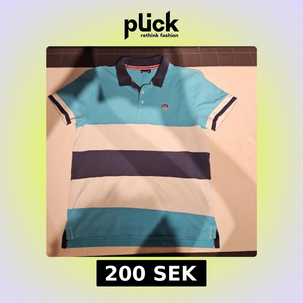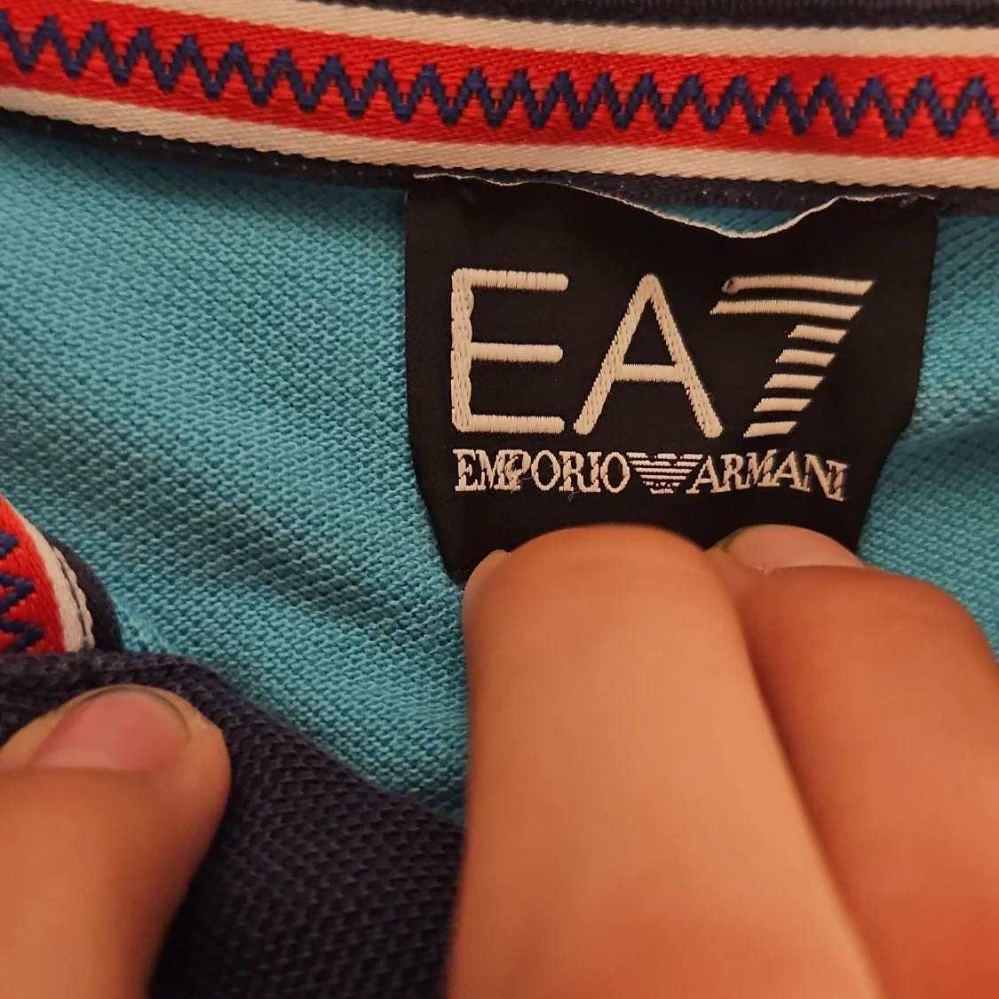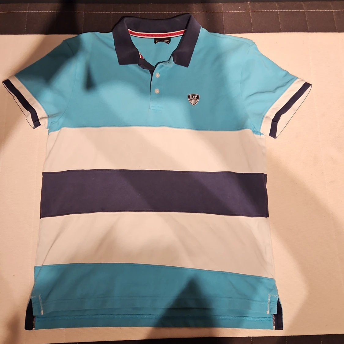 Snygg pikétröja från EA7 Emporio Armani med breda ränder i turkos, vitt och marinblått. Klassisk krage, knappar framtill och logga på bröstet. Perfekt för dig som gillar stilren och sportig look. Man kan se lite slitage på logga som är på bröstet.
