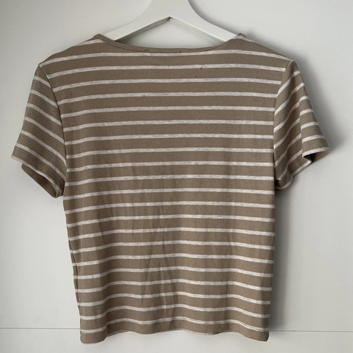 Säljer en jätte fin beige/ vit randig topp. Lite kortare än en vanlig T-shirt i modellen. Använd ca 5ggr. Strl L❤️