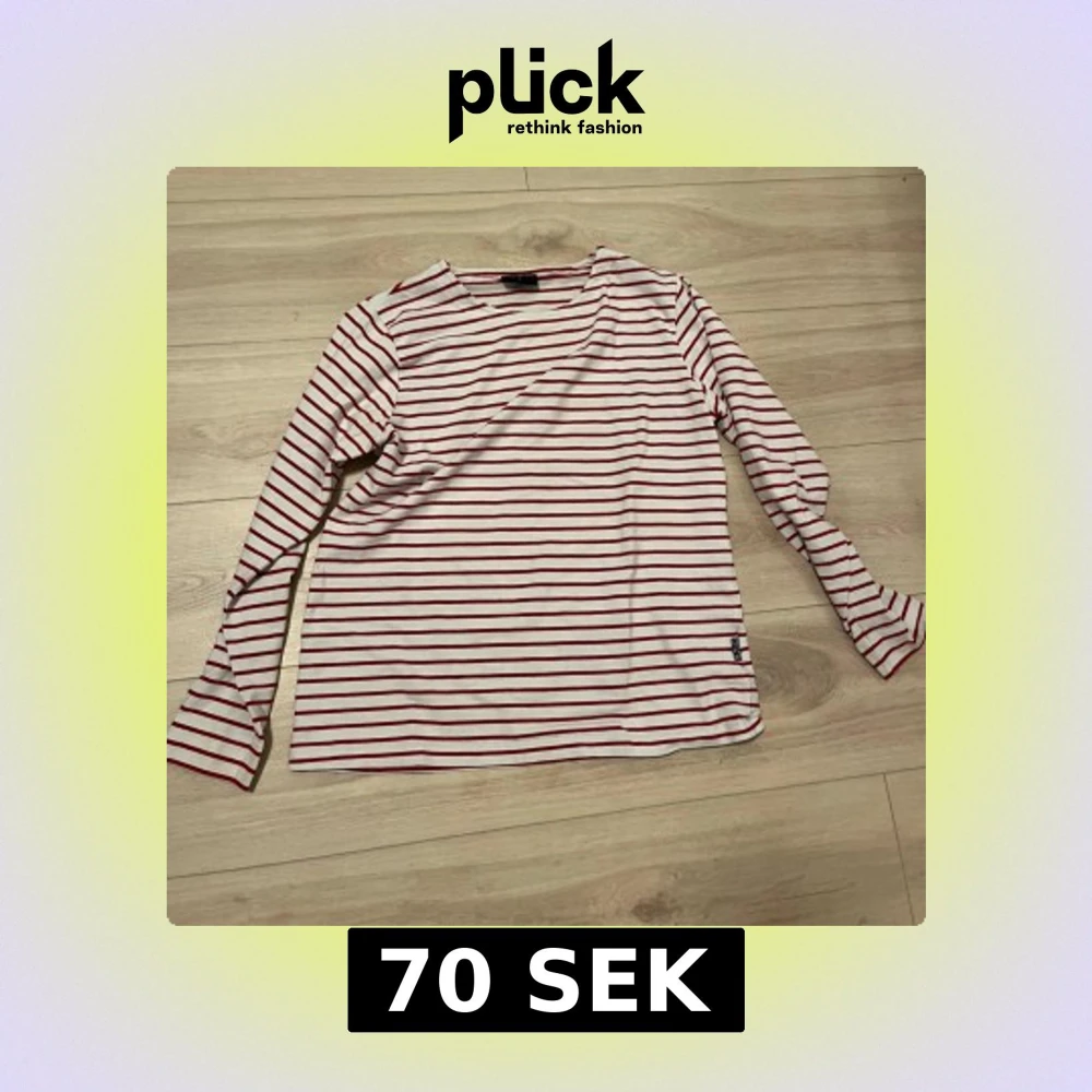 Säljer en stilren randig tröja med röda och vita ränder. Tröjan har långa ärmar och en bekväm passform. Perfekt för en avslappnad stil.