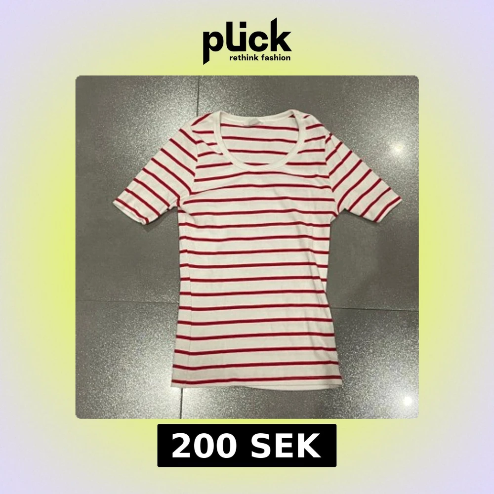 Snygg vit t-shirt med röda ränder. Den har en rund halsringning och korta ärmar. Skriv för mer bilder eller andra frågor :)