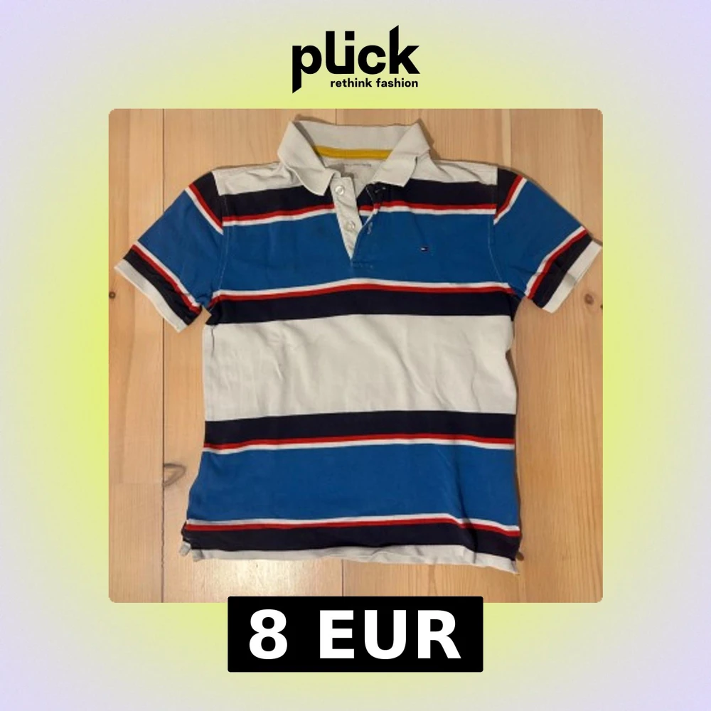 Säljer en klassisk pikétröja från Tommy Hilfiger med breda ränder i blått, vitt, svart och rött. Tröjan har korta ärmar, krage och knappar framtill. Perfekt för en avslappnad och stilren look.
