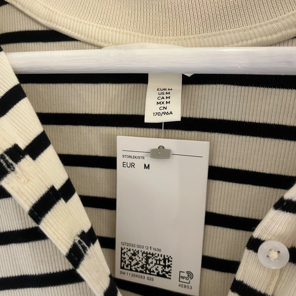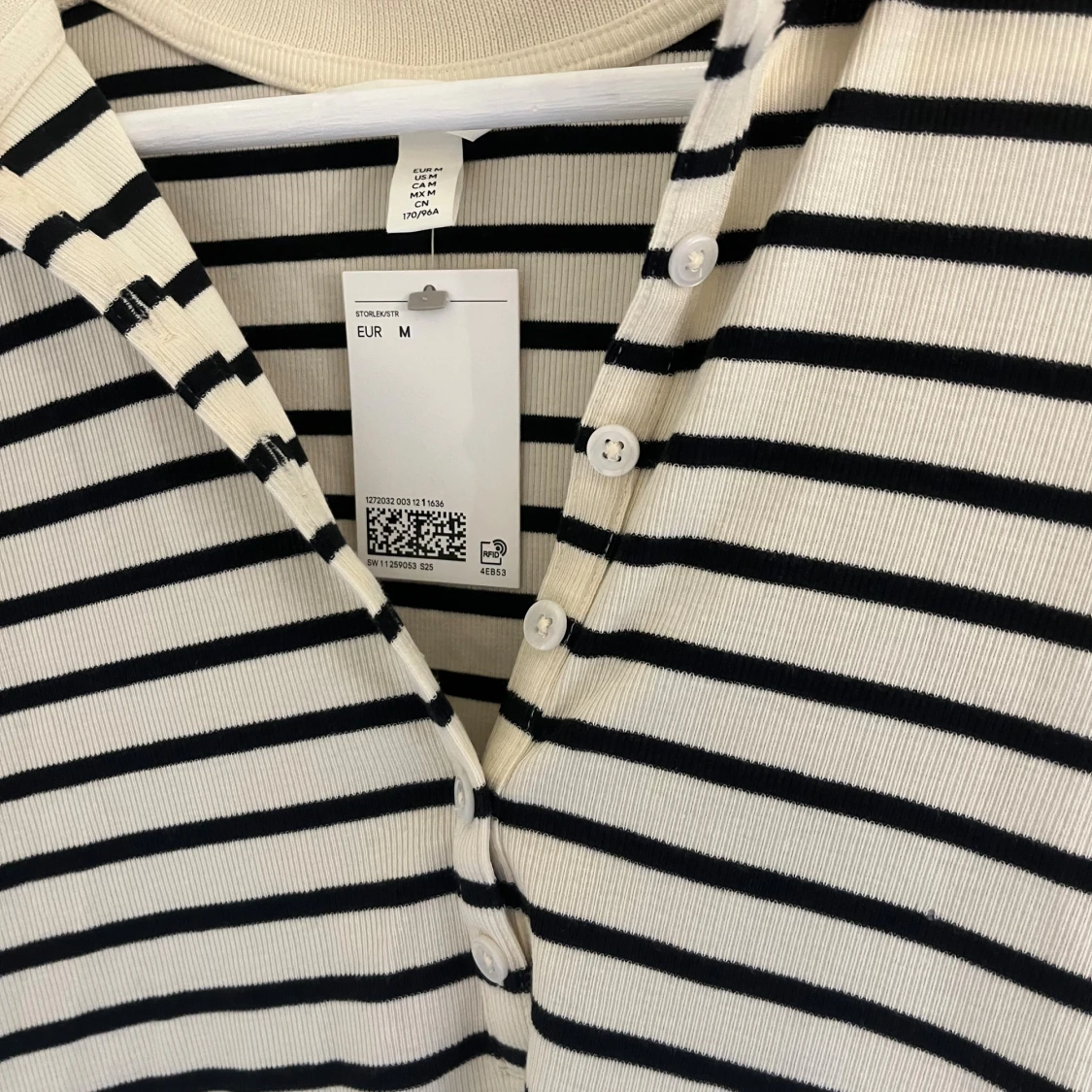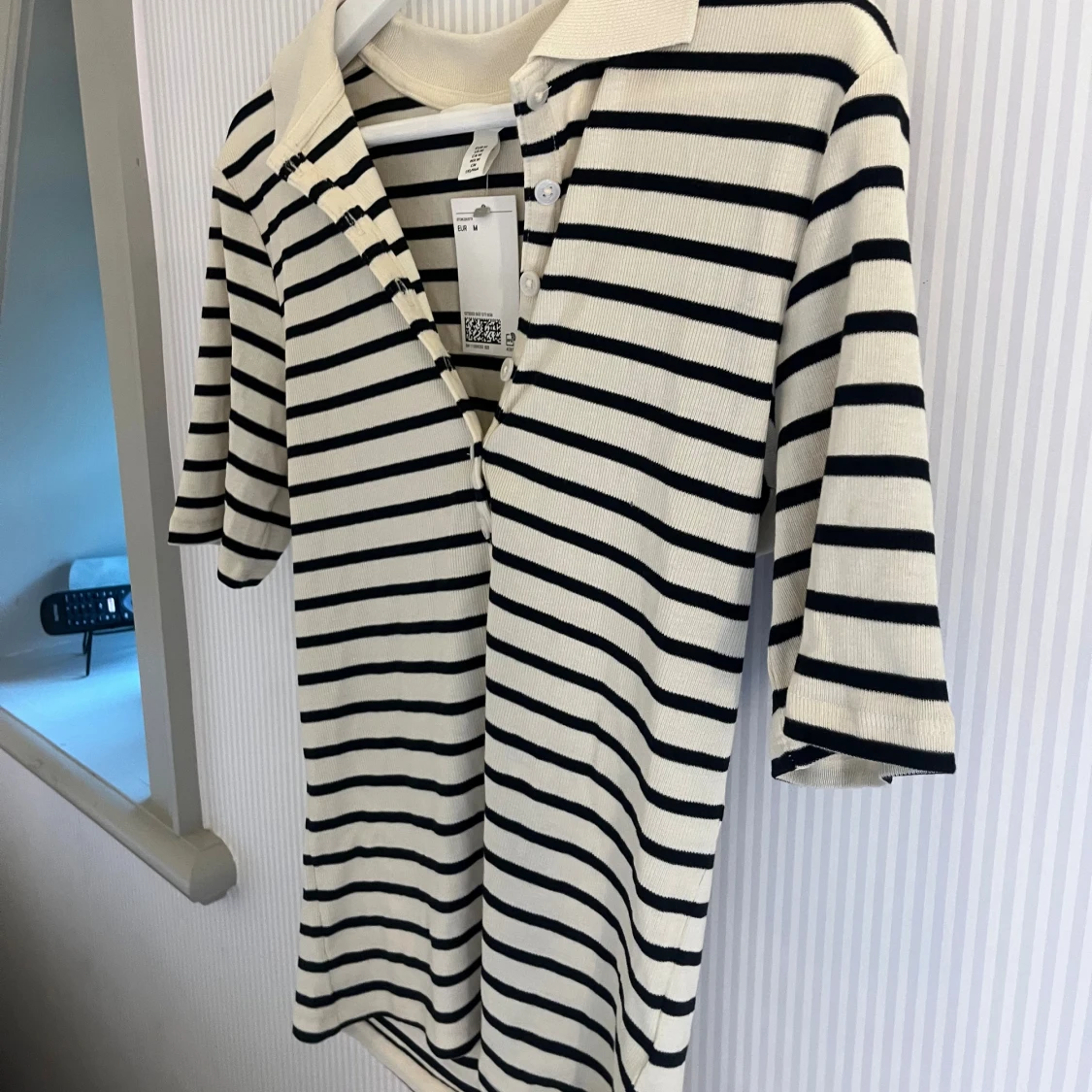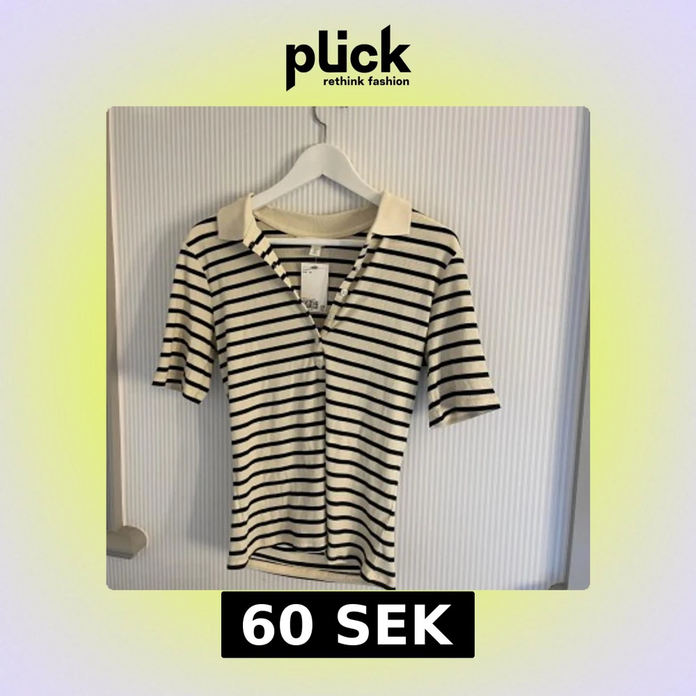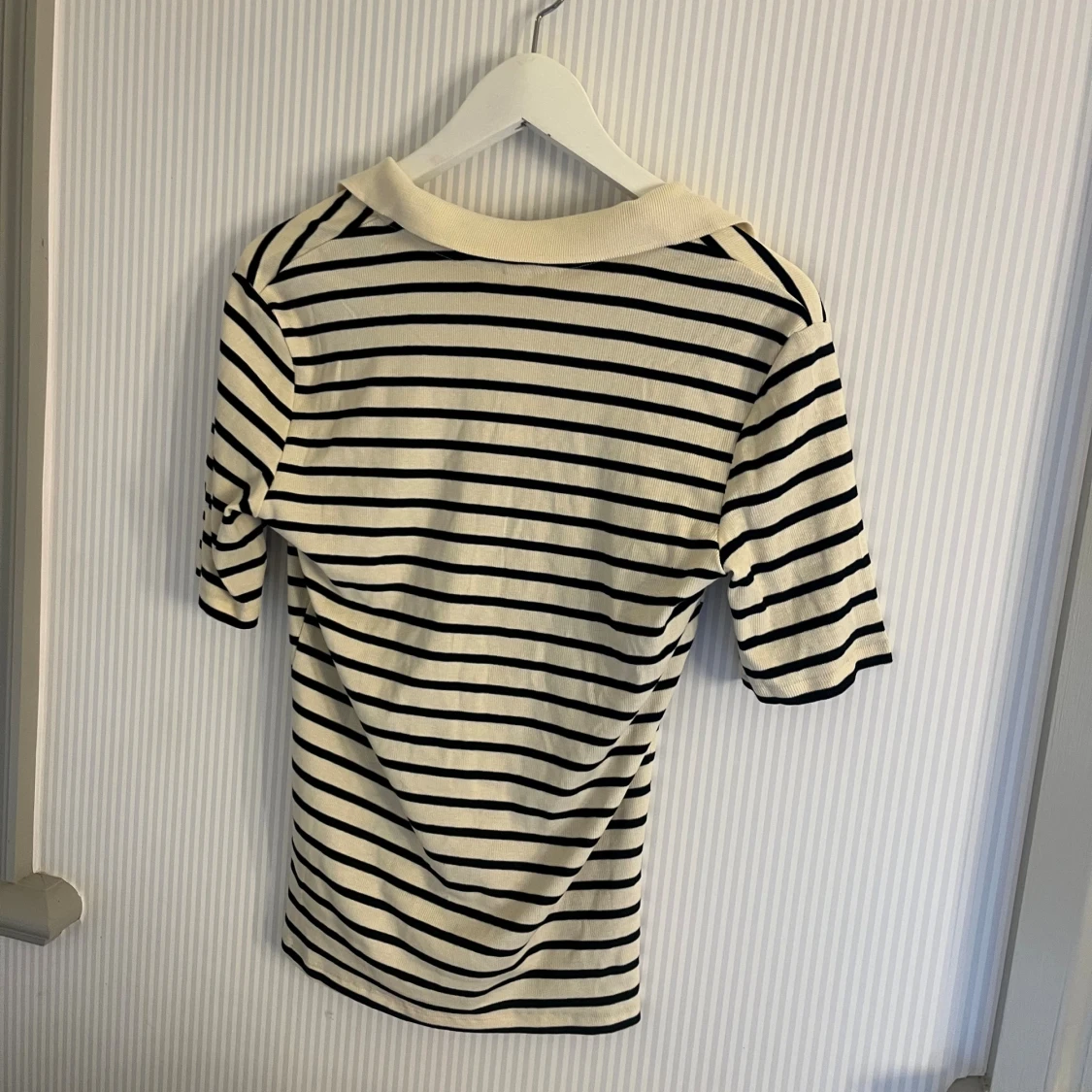 Snygg ribbad t-shirt från H&M i storlek M, med svart och vit randigt mönster. Modellen har korta ärmar, klassisk krage och knappar framtill. Perfekt för dig som gillar en clean och stilren look med lite preppy vibe.