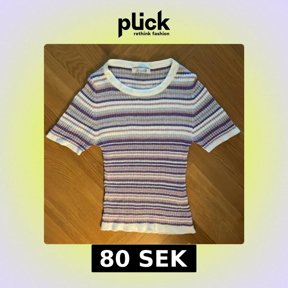 Säljer en snygg ribbad topp från Design by Si i storlek XS/S. Tröjan har korta ärmar och är randig i vitt, lila och rosa med inslag av glittrigt material.