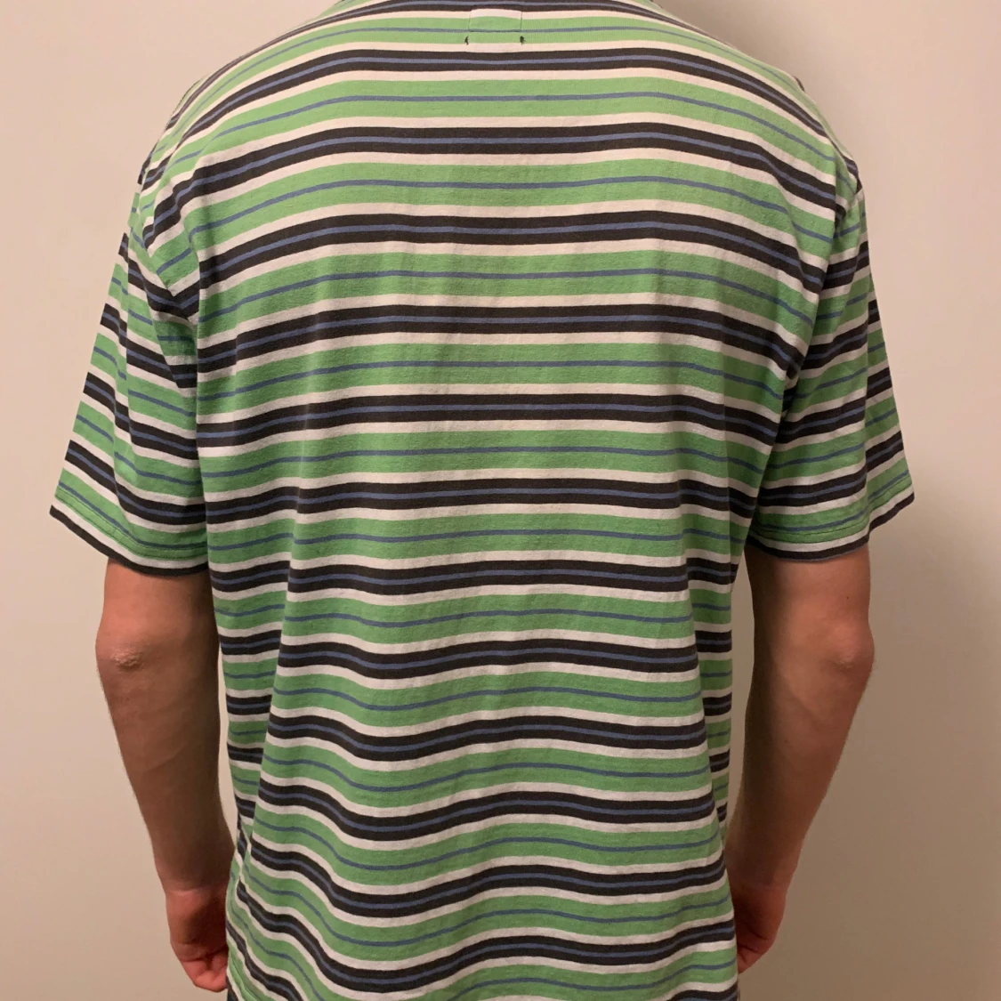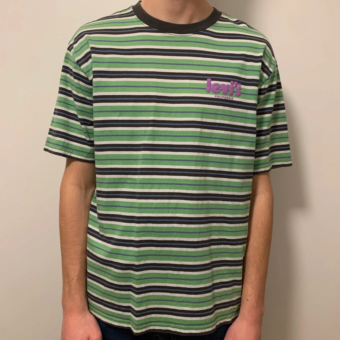 Säljer en randig t-shirt från Levi's i grönt, svart och vitt. T-shirten har korta ärmar och en normal passform. Perfekt för en avslappnad stil.
