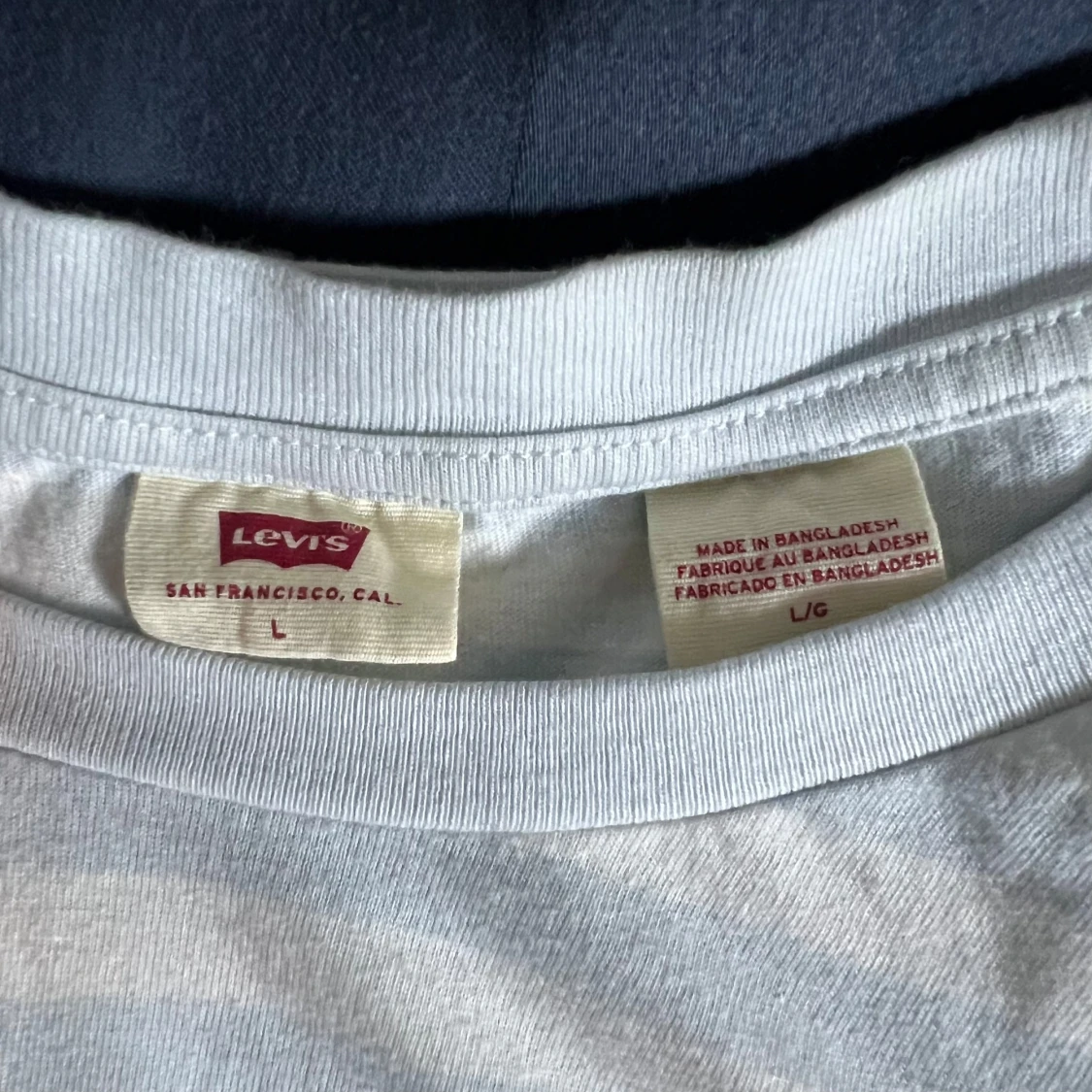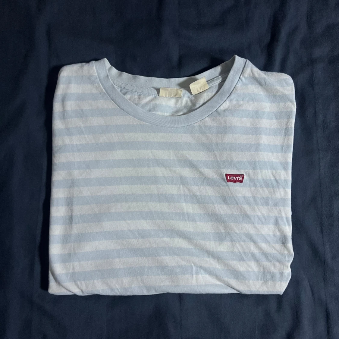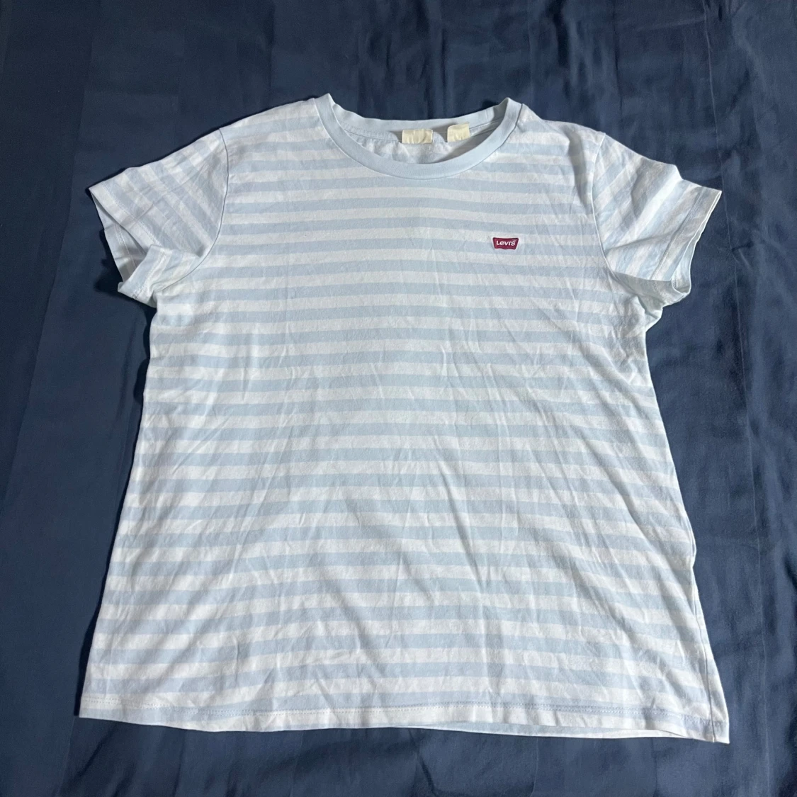 Säljer en stilren ljusblå och vit randig t-shirt från Levi's. Den har en klassisk rund halsringning och korta ärmar. Perfekt för en avslappnad look.