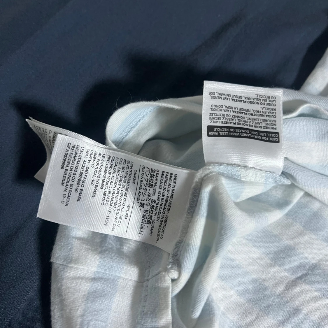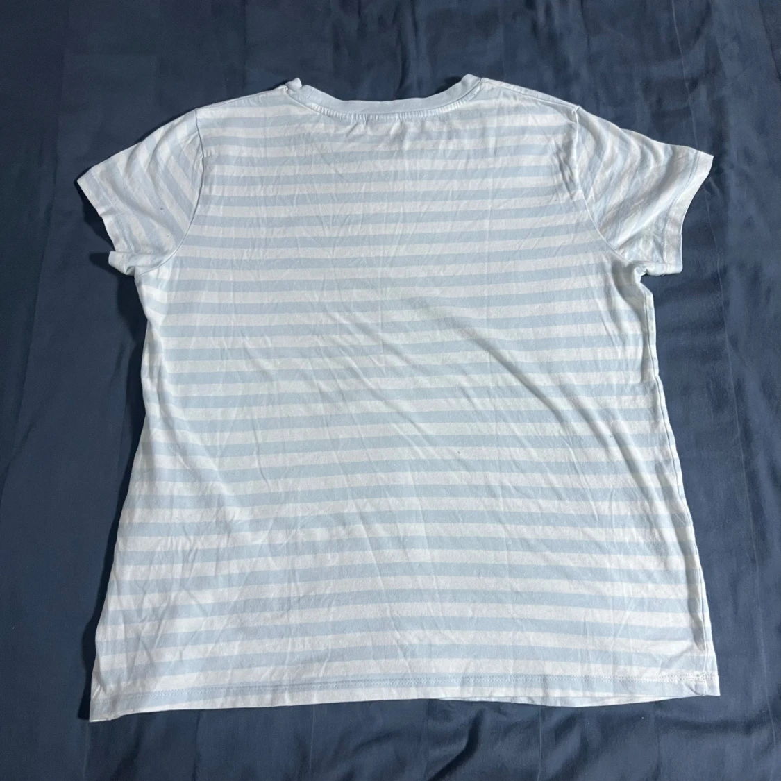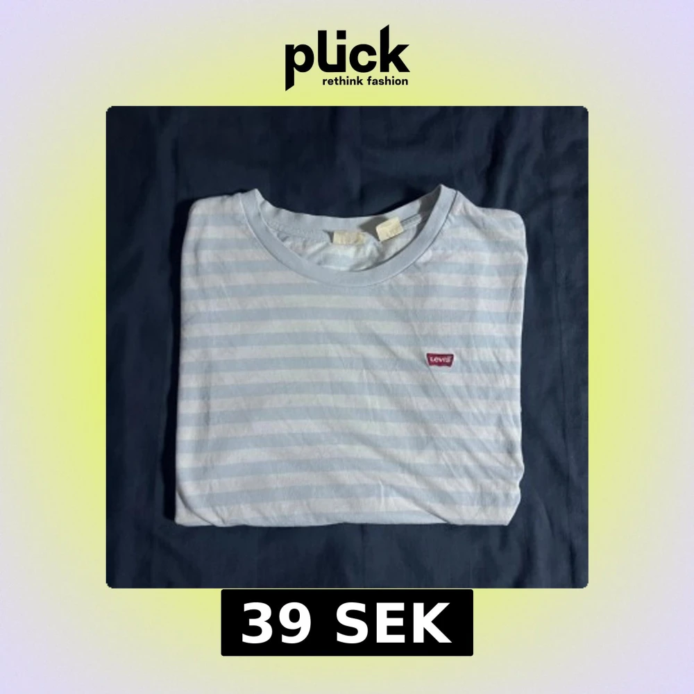 Säljer en stilren ljusblå och vit randig t-shirt från Levi's. Den har en klassisk rund halsringning och korta ärmar. Perfekt för en avslappnad look.