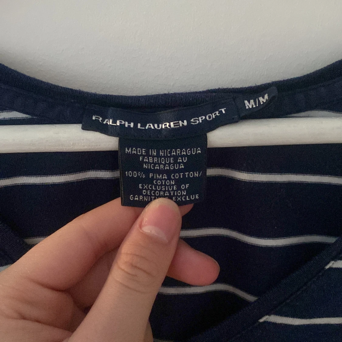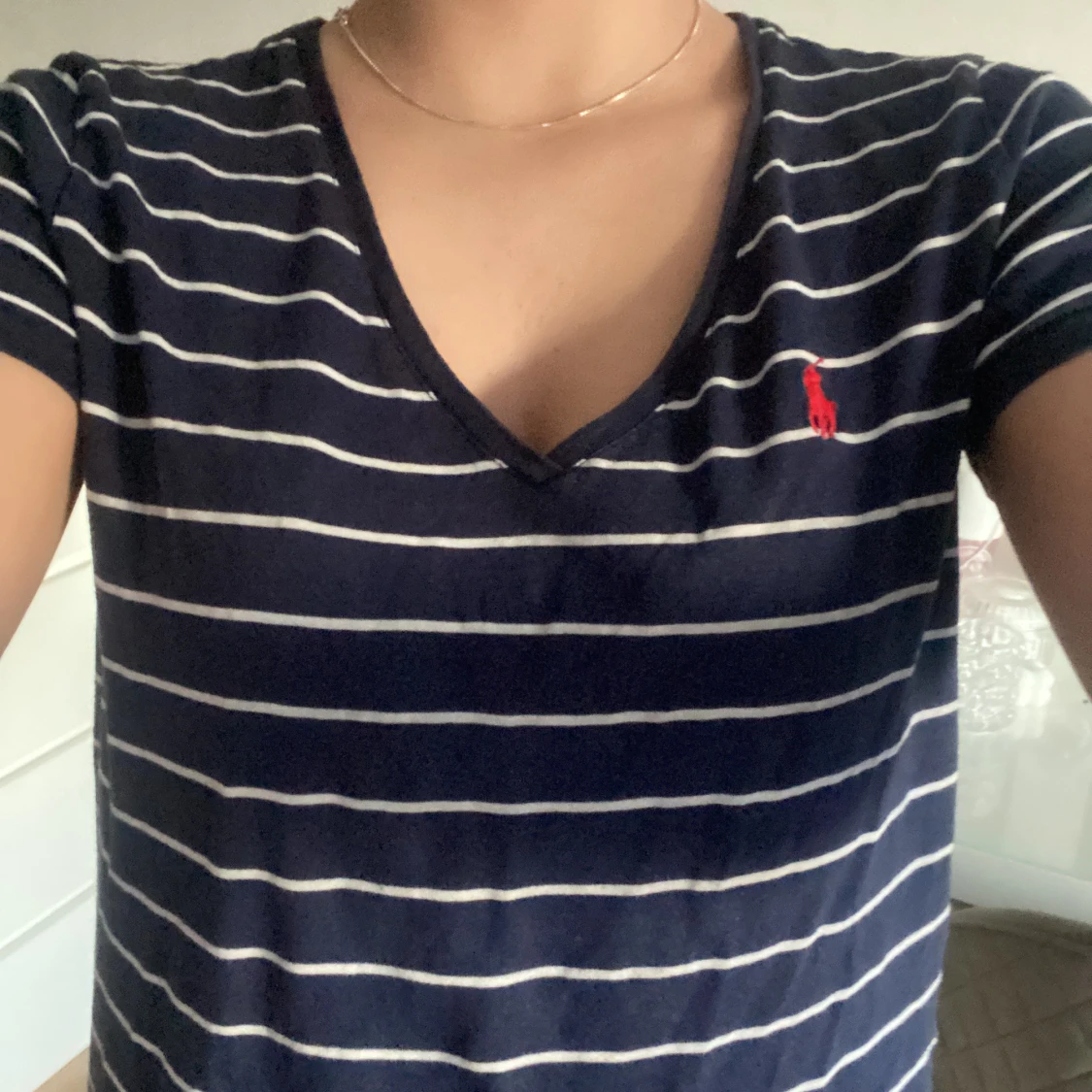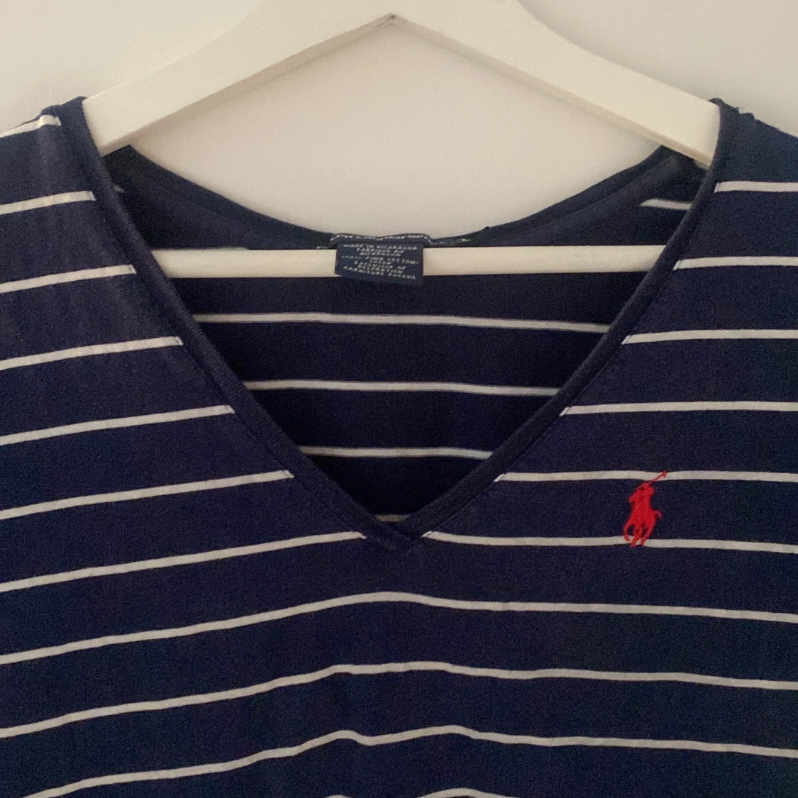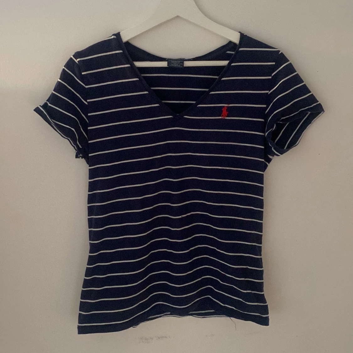 Säljer en jätte snygg vitrandiga marinblå tröja som är V-ringad från Ralph Lauren. Den är i strl M men passar som S❤️Det är ett litet hål på magen men det är inget man tänker på, annars är den som ny❣️ har använt ett fåtal gånger!