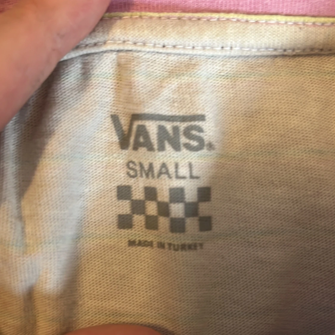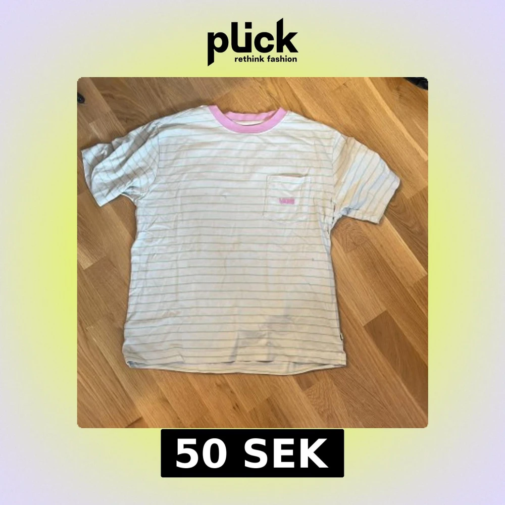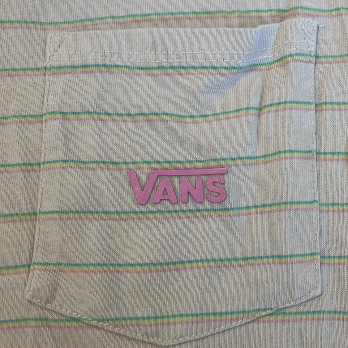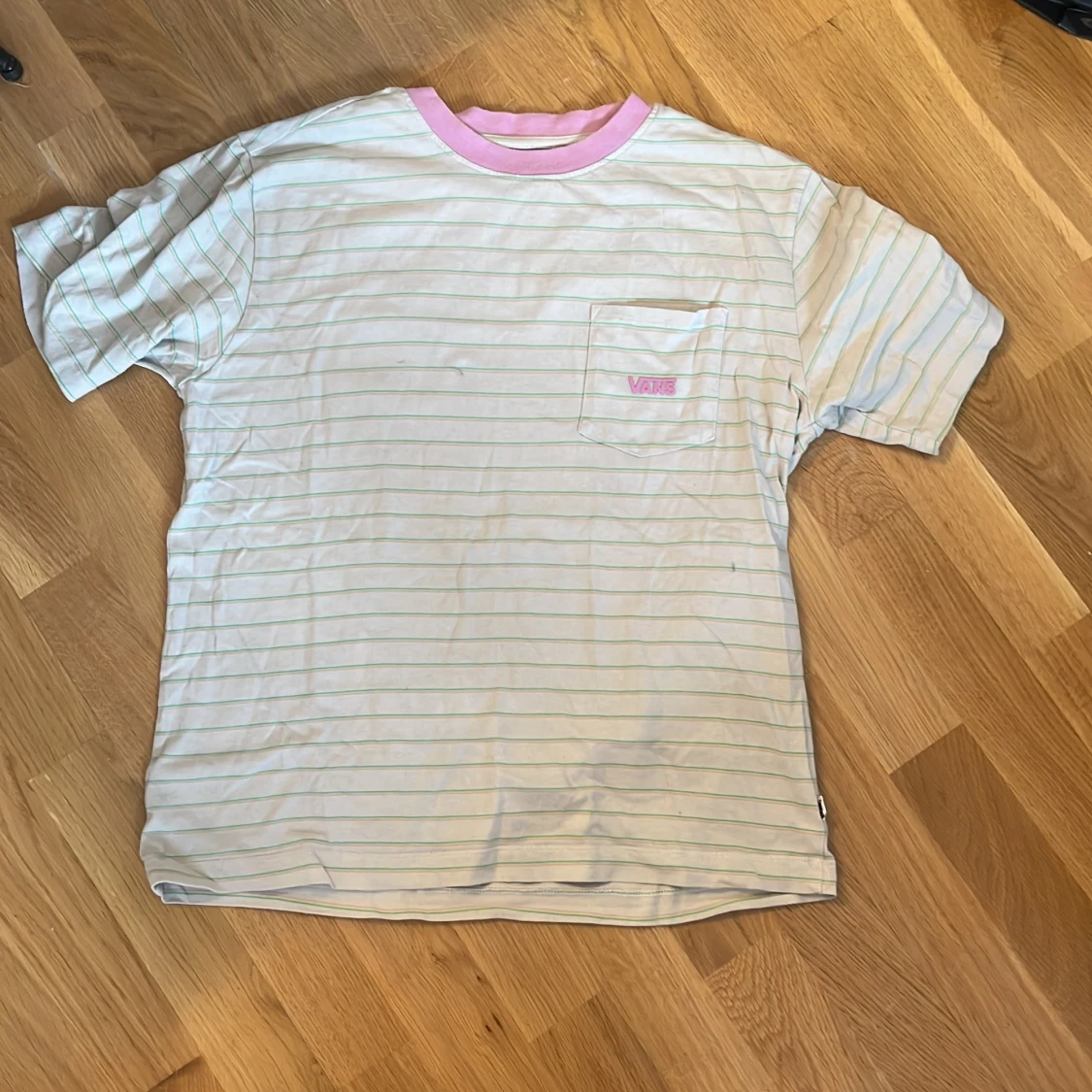 Vit t-shirt från Vans med tunna gröna och rosa ränder, rosa krage och bröstficka med rosa Vans-logga. Klassisk passform och korta ärmar, perfekt för en chill streetstyle. Gjord i mjuk bomull för skön känsla hela dagen.