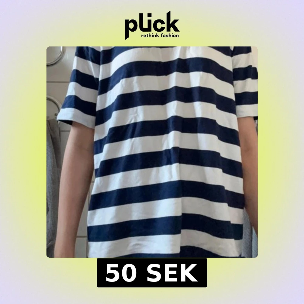 Säljer en klassisk t-shirt med breda marinblå och vita ränder. T-shirten har korta ärmar och en avslappnad passform, perfekt för en chill och stilren look. Tillverkad i mjuk bomull som känns skön mot huden.