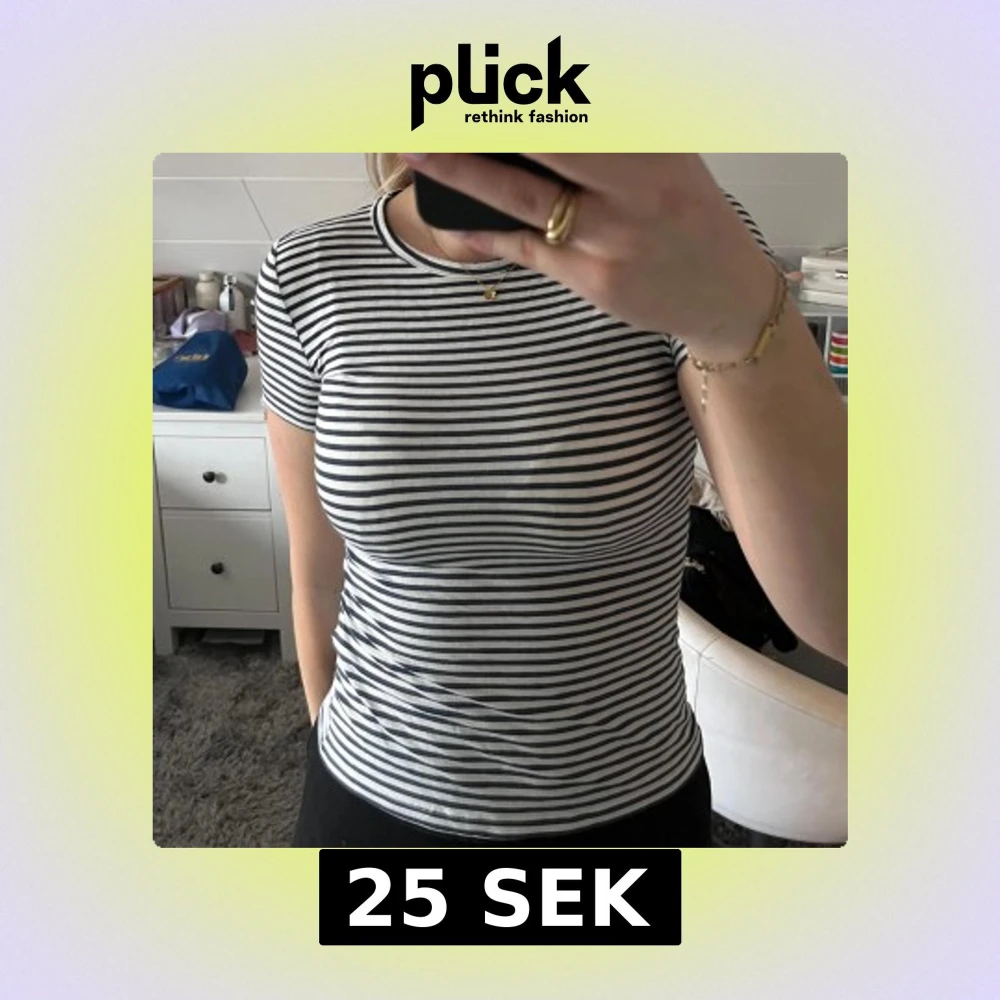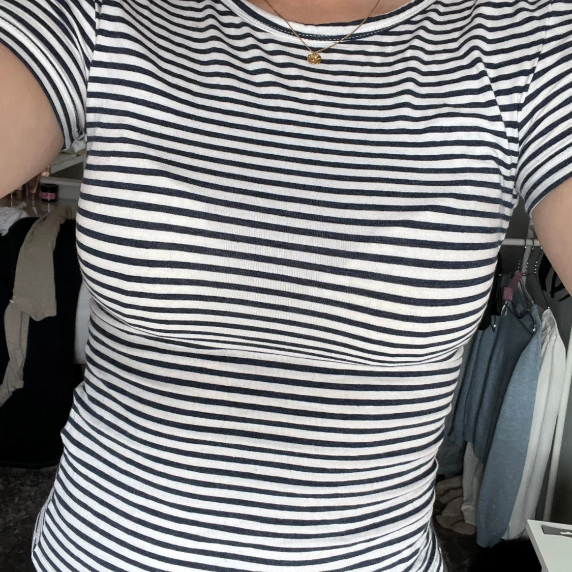 Säljer en klassisk randig t-shirt i marinblå och vit. Den har en tight passform och korta ärmar med ett mjukt material.