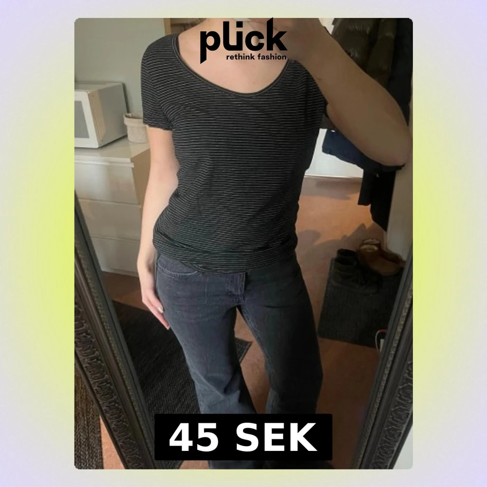 En svart t-shirt med tunna vita ränder från H&M Basic. Modellen är klassisk med rund halsringning och korta ärmar. Storlek m men passar xs/s bra!