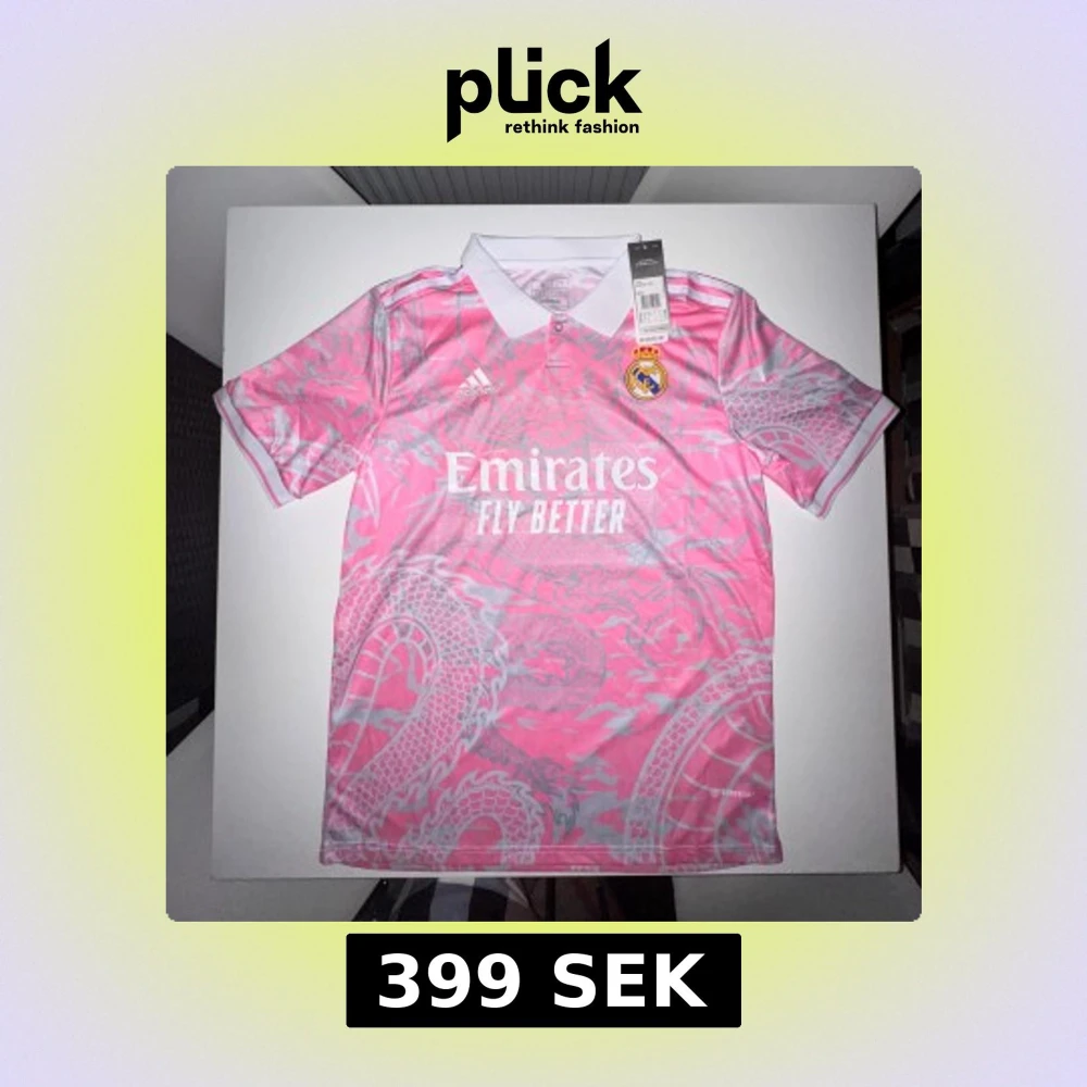 Snygg rosa Real Madrid fotbollströja från Adidas med grått drakmönster och vit krage. Tröjan har korta ärmar, broderad klubbmärke och Adidas-logga samt tryckt sponsor. Tillverkad i lätt och ventilerande material, perfekt för match eller träning.