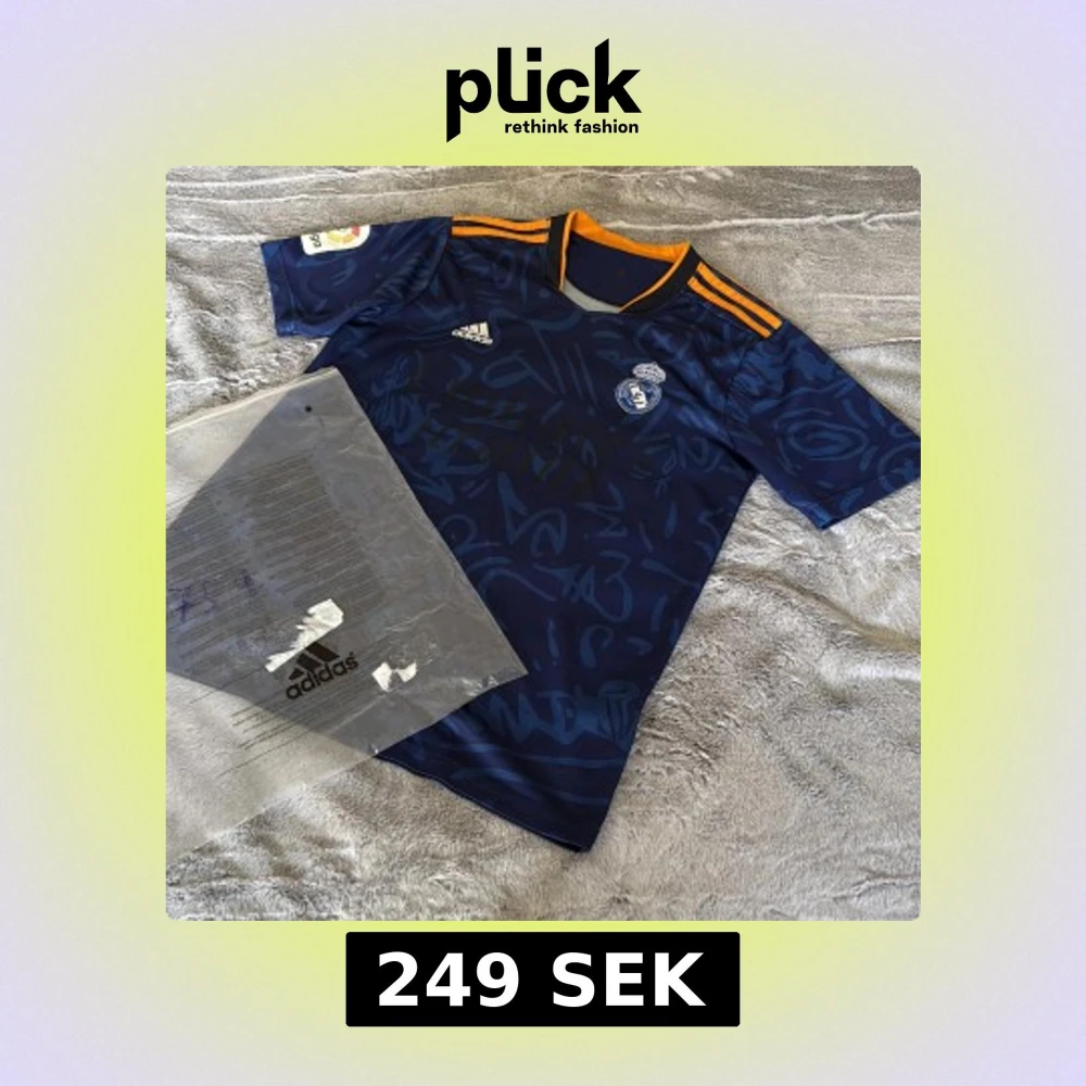 Säljer en blå Real Madrid bortatröja från Adidas med orange detaljer på axlarna och grafiskt mönster över hela tröjan. Broderad klubbmärke och Adidas-logga på bröstet. Tillverkad i lätt och ventilerande polyester, perfekt för match eller träning.