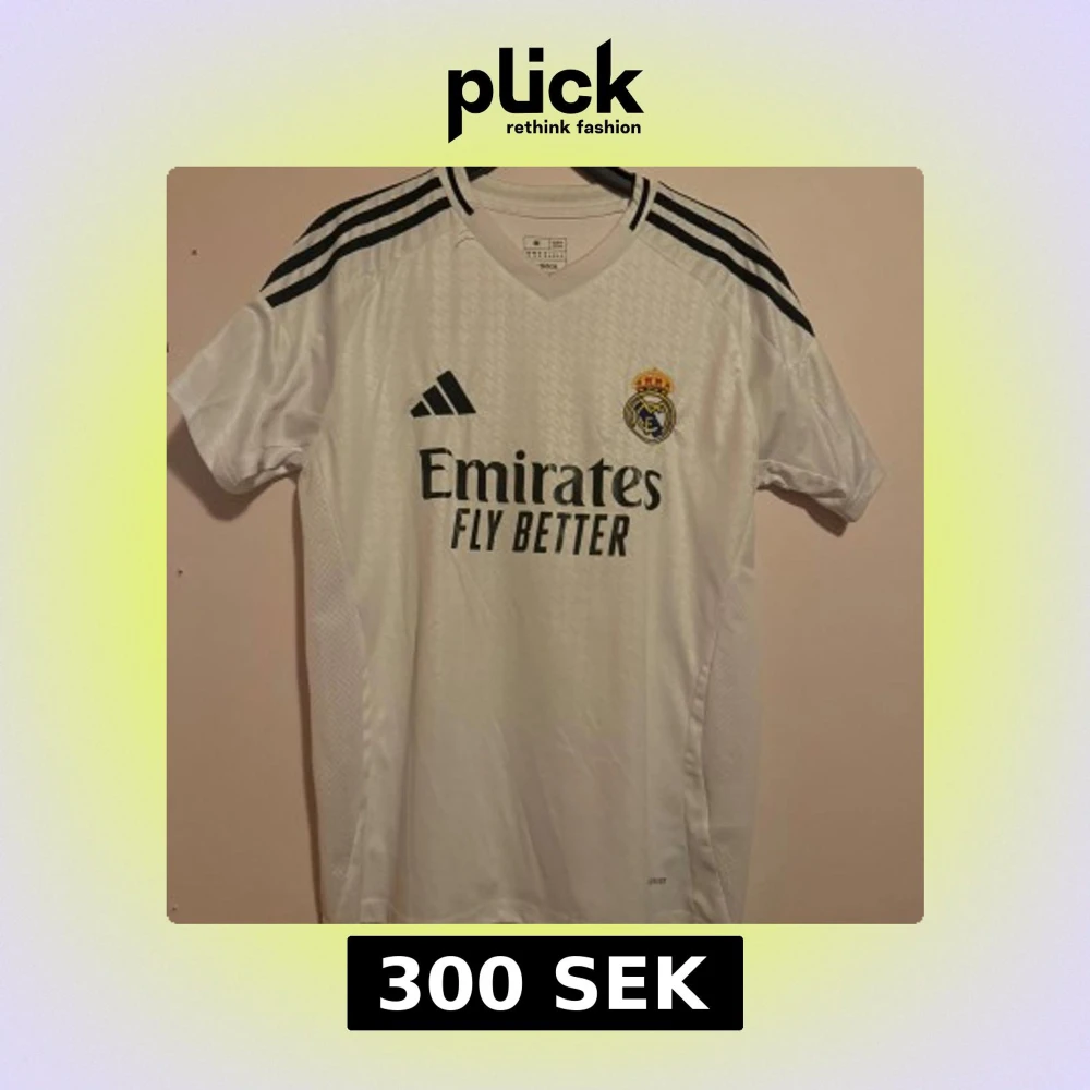 Säljer en officiell Real Madrid fotbollströja från Adidas med Bellingham och nummer 5 på ryggen. Tröjan är vit med svarta detaljer, klubbmärke på bröstet, Champions League-patch på ärmen och Emirates Fly Better-tryck. Tillverkad i lätt och ventilerande material.
