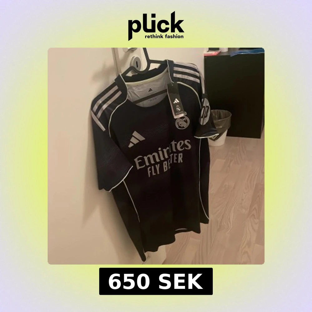 Snygg mörkblå Real Madrid fotbollströja från Adidas med vita detaljer och klubbmärke på bröstet. Tröjan har korta ärmar, klassiska Adidas-ränder på axlarna och tryck med 'Emirates Fly Better' på framsidan. Perfekt för alla fotbollsfans! Den är i storlek S. Om ni har frågor kan ni höra av er!