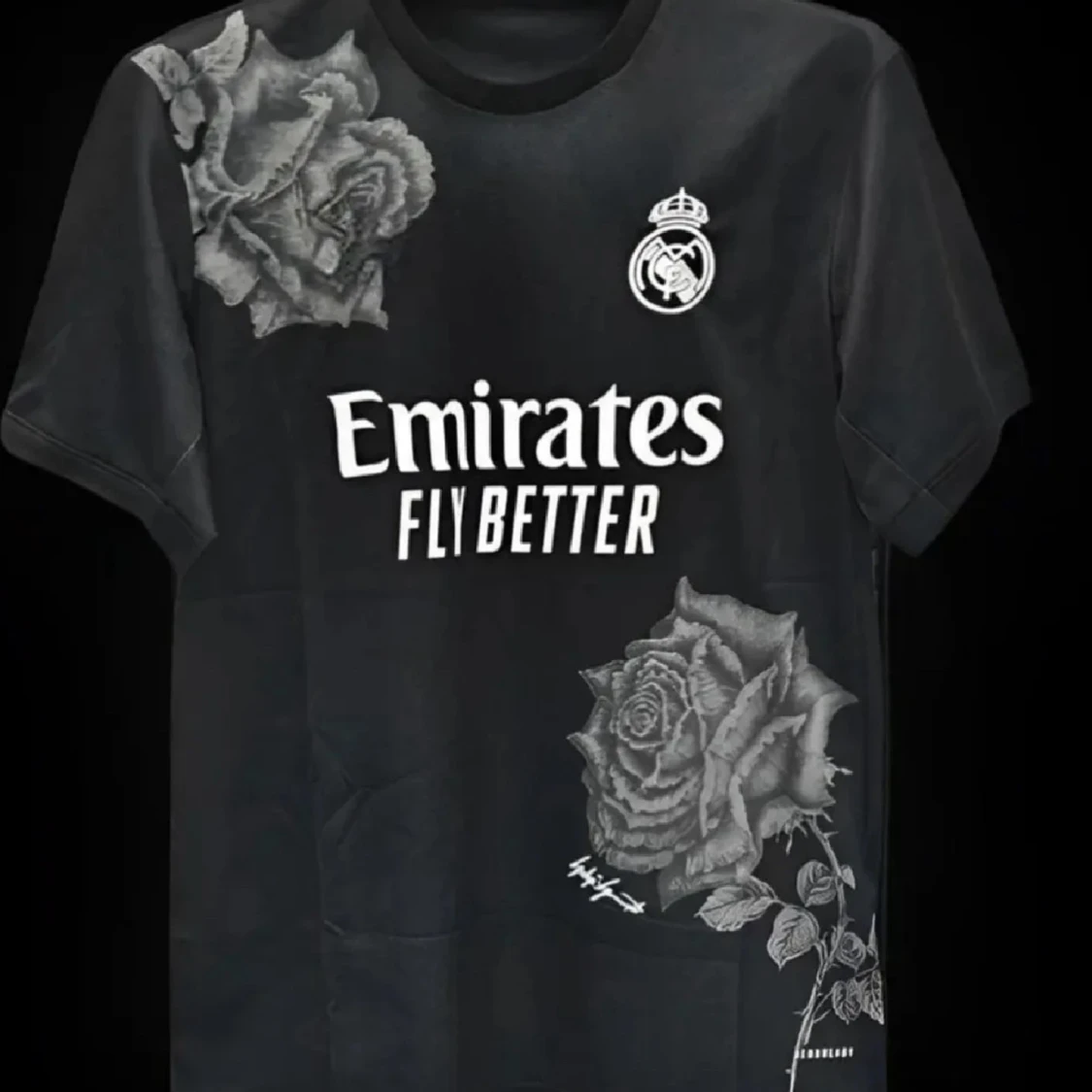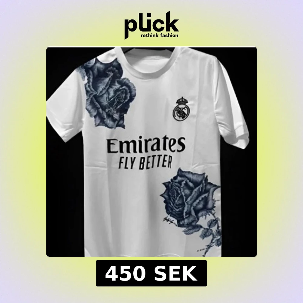 Unik Real Madrid fotbollströja i polyester med stora ros-motiv på axel och nederkant. Finns i både vit och svart med klubbmärke och Emirates Fly Better-tryck på bröstet. Går att fixa eget nummer och namn det blir dock 85 kr dyrare