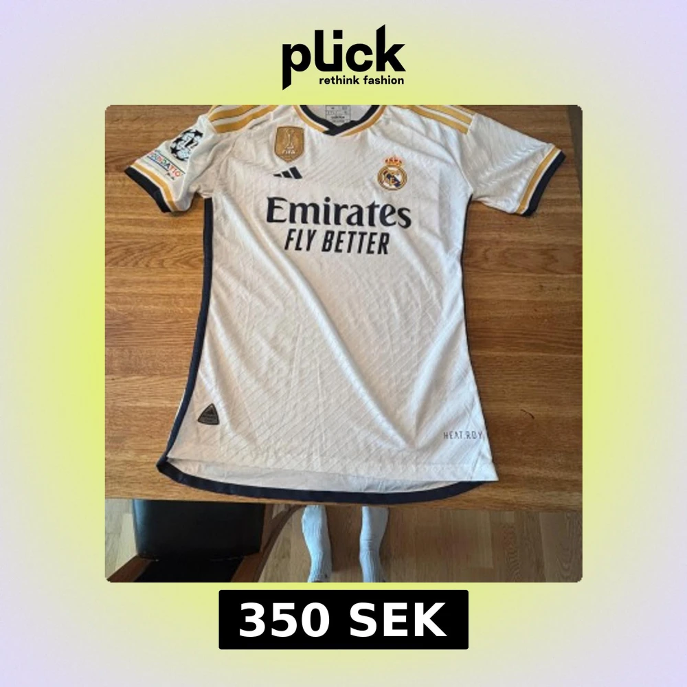 Säljer en vit Real Madrid hemmatröja från Adidas med guld- och svarta detaljer. Tröjan har klubbmärke, sponsortryck och FIFA-märke på bröstet samt randiga axlar. Kortärmad modell i lätt funktionsmaterial.