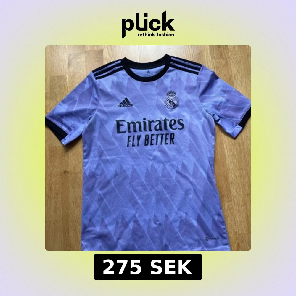Säljer en lila Real Madrid bortatröja från Adidas med svart krage och svarta detaljer. Tröjan har geometriskt mönster, korta ärmar och är tillverkad i lätt och ventilerande Aeroready-material. Perfekt för dig som vill sticka ut på planen eller läktaren.