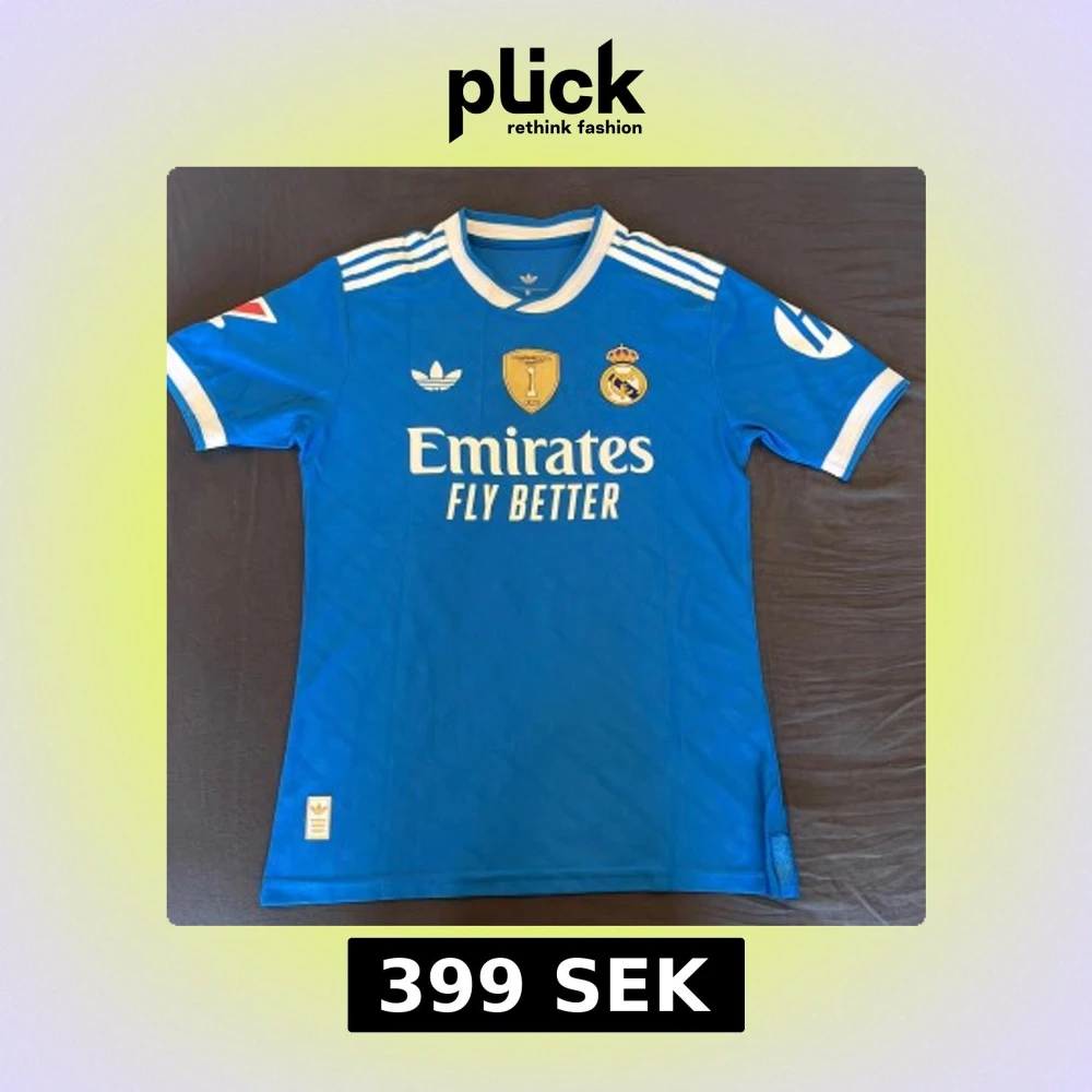 Blå Real Madrid fotbollströja från Adidas med vita detaljer och tryck. Mbappé 10 på ryggen, klubbmärke och Adidas-logga på bröstet. Tillverkad i lätt och ventilerande polyester, klassisk passform och korta ärmar. Snygga vita ränder på axlarna och broderade emblem.