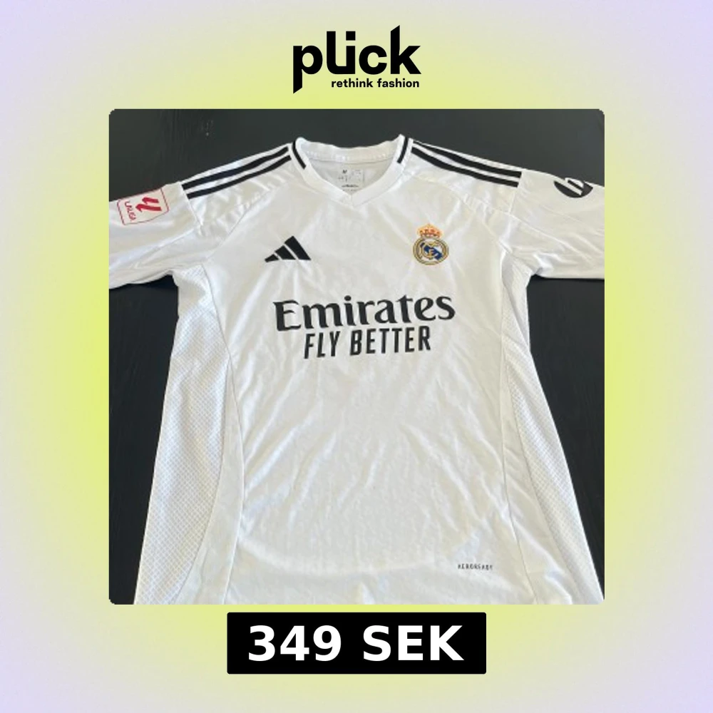 Snygg vit Real Madrid fotbollströja från Adidas med Mbappé och nummer 9 på ryggen. Tröjan har svarta detaljer, klubbmärke på bröstet, La Liga-märke på ärmen och klassiska Adidas-ränder på axlarna. Tillverkad i lätt och ventilerande material.