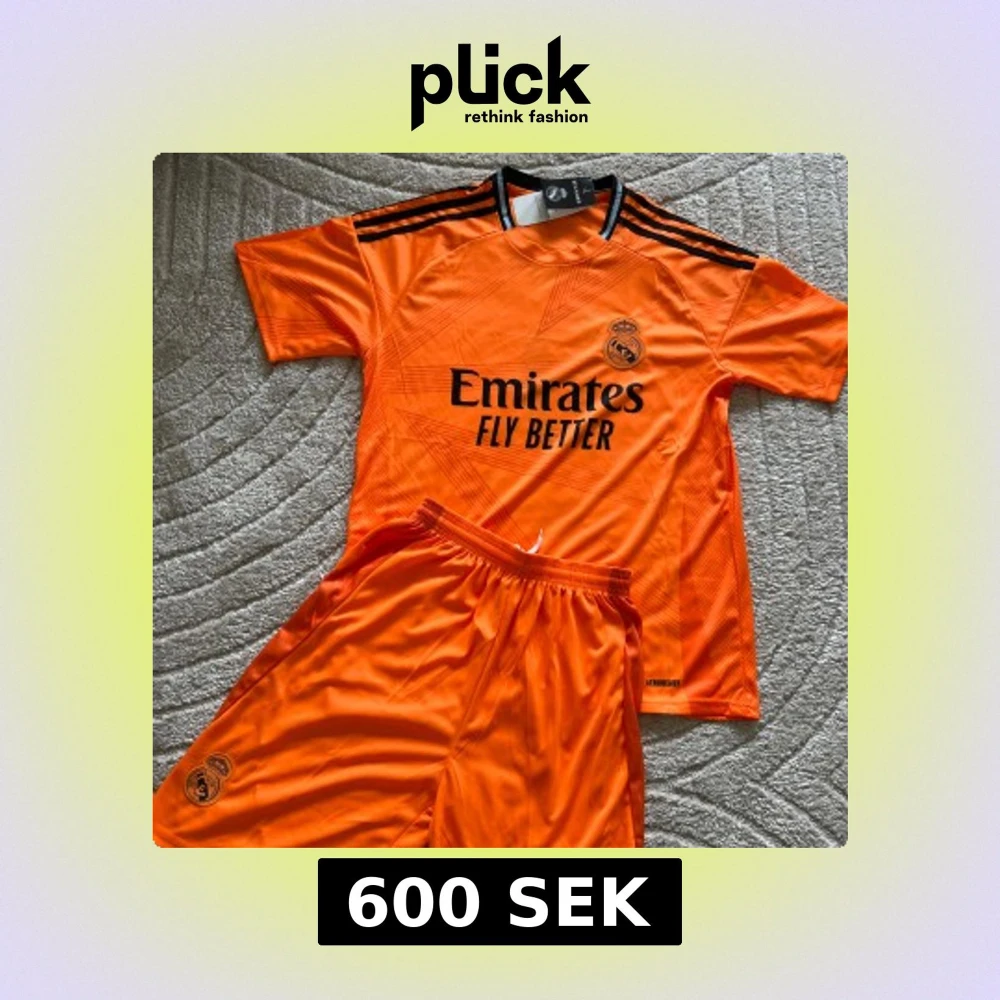 Snygg orange Real Madrid fotbolls kit med Mbappé och nummer 9 på ryggen. Tröjan har svarta detaljer, Adidas klassiska ränder på axlarna och klubbmärke på bröstet. Tillverkad i lätt och ventilerande material, perfekt för träning eller match.