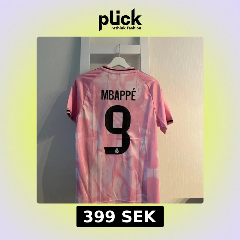 Säljer en rosa Real Madrid fotbollströja från Adidas med Mbappé och nummer 9 på ryggen. Tröjan har svart tryck, korta ärmar och klassiska Adidas-ränder på axlarna. Materialet är lätt och andas, perfekt för träning eller match.