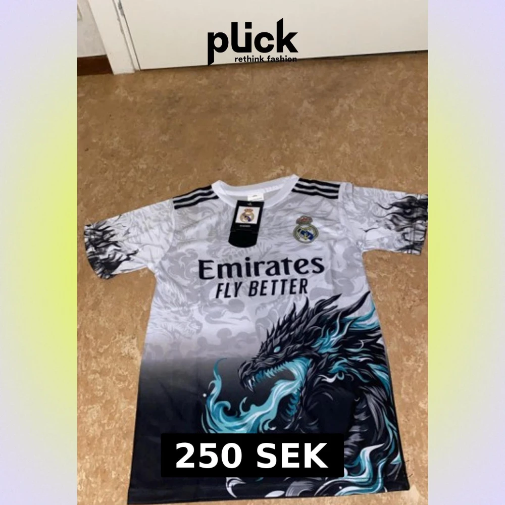 Säljer en unik Real Madrid fotbollströja med Ronaldo 7 på ryggen. Tröjan är vit och svart med ett fett drakmotiv i blått och turkost framtill, samt klubbmärke och Emirates-tryck. Materialet är 100% polyester och modellen är kortärmad. Ingår svarta shorts med klubbmärke.