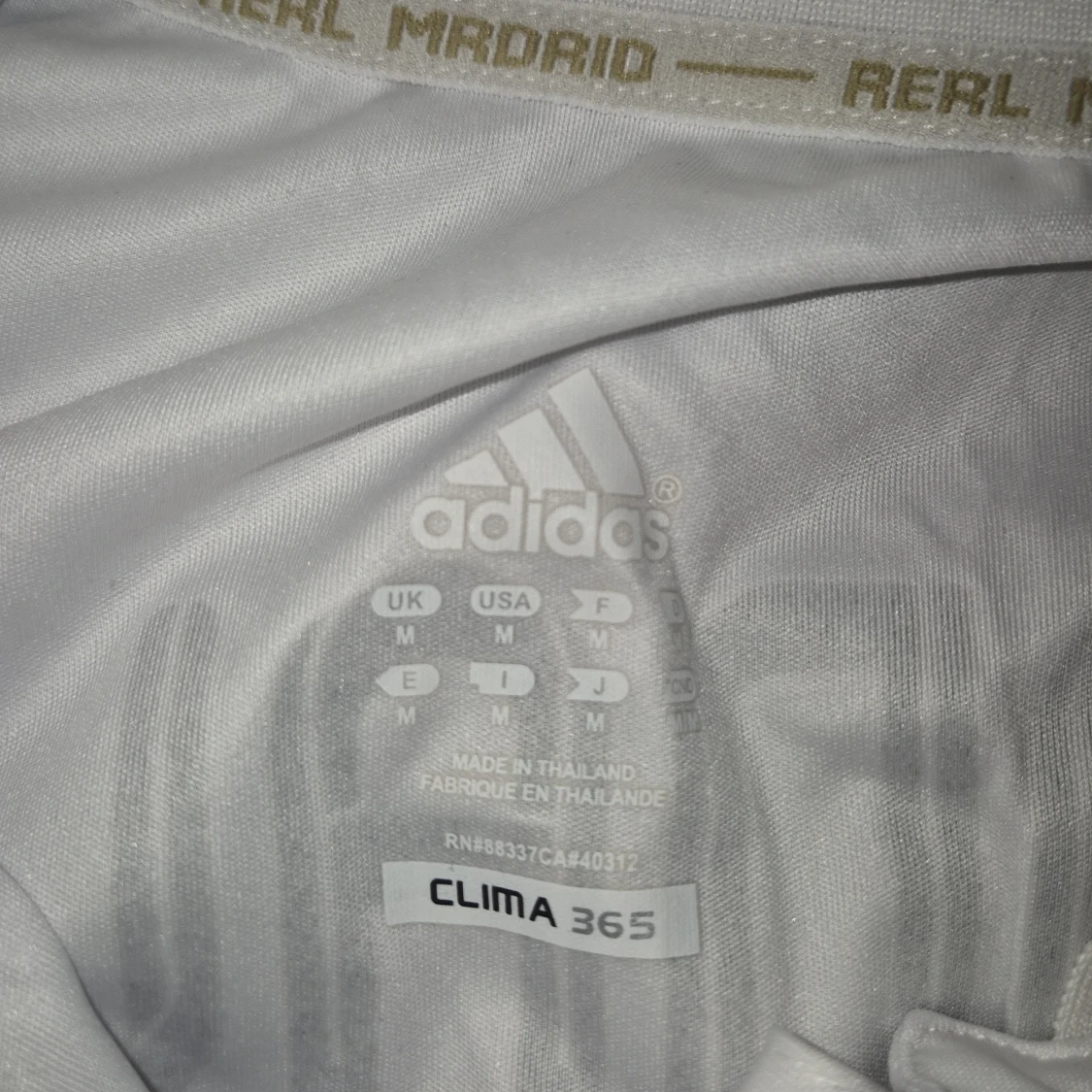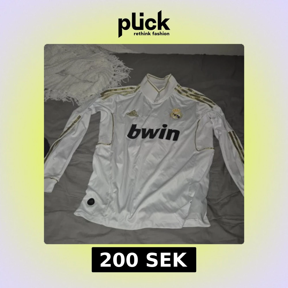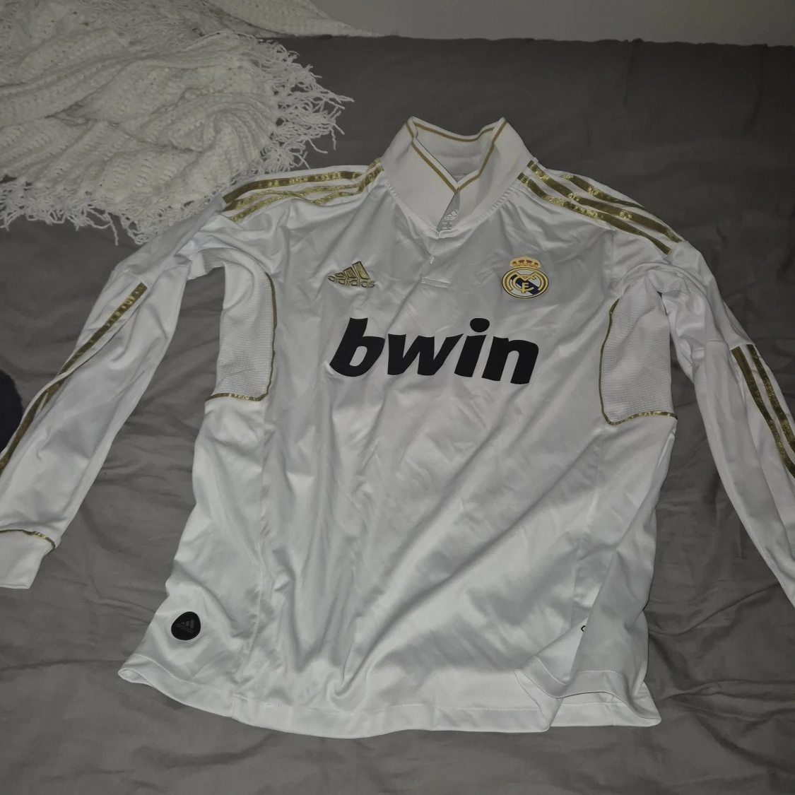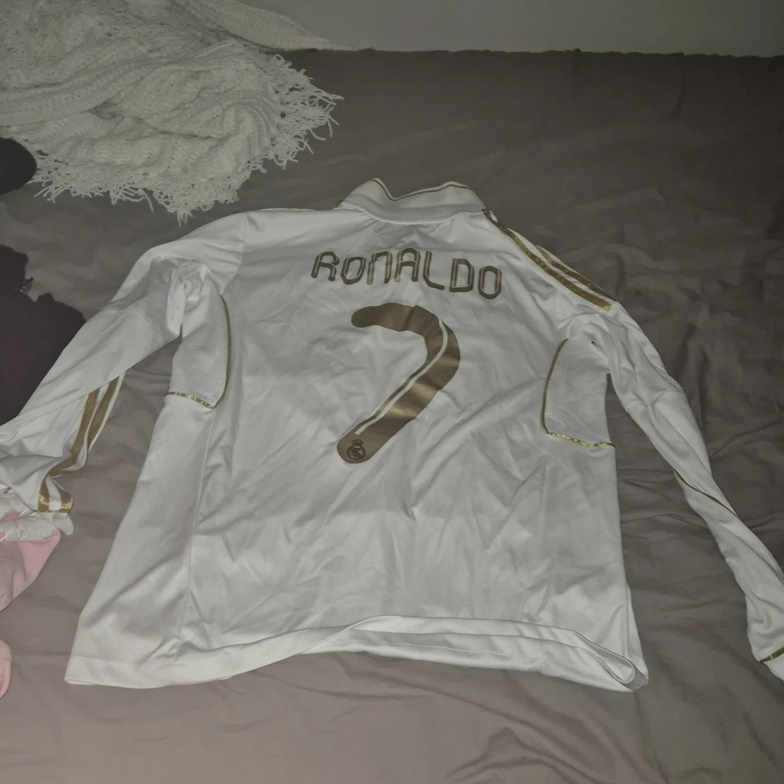 Säljer en officiell Real Madrid långärmad fotbollströja från Adidas med Ronaldo och nummer 7 på ryggen. Tröjan är vit med guldiga detaljer och Adidas-logga broderad på bröstet. Materialet är lätt och andas, Clima365-teknologi. Snygga guldiga ränder på axlarna.
