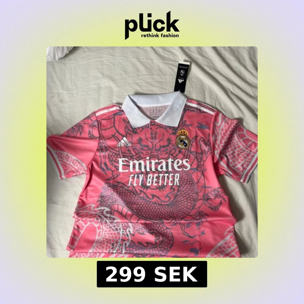 Snygg Real Madrid fotbollströja från Adidas i rosa med grått drakmönster över hela tröjan. Klassisk vit krage och vita detaljer på ärmarna. Broderat klubbmärke på bröstet och tryckt sponsorlogga. Tillverkad i lätt och ventilerande polyester.