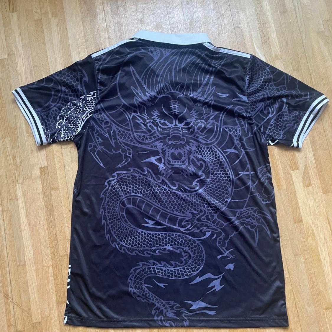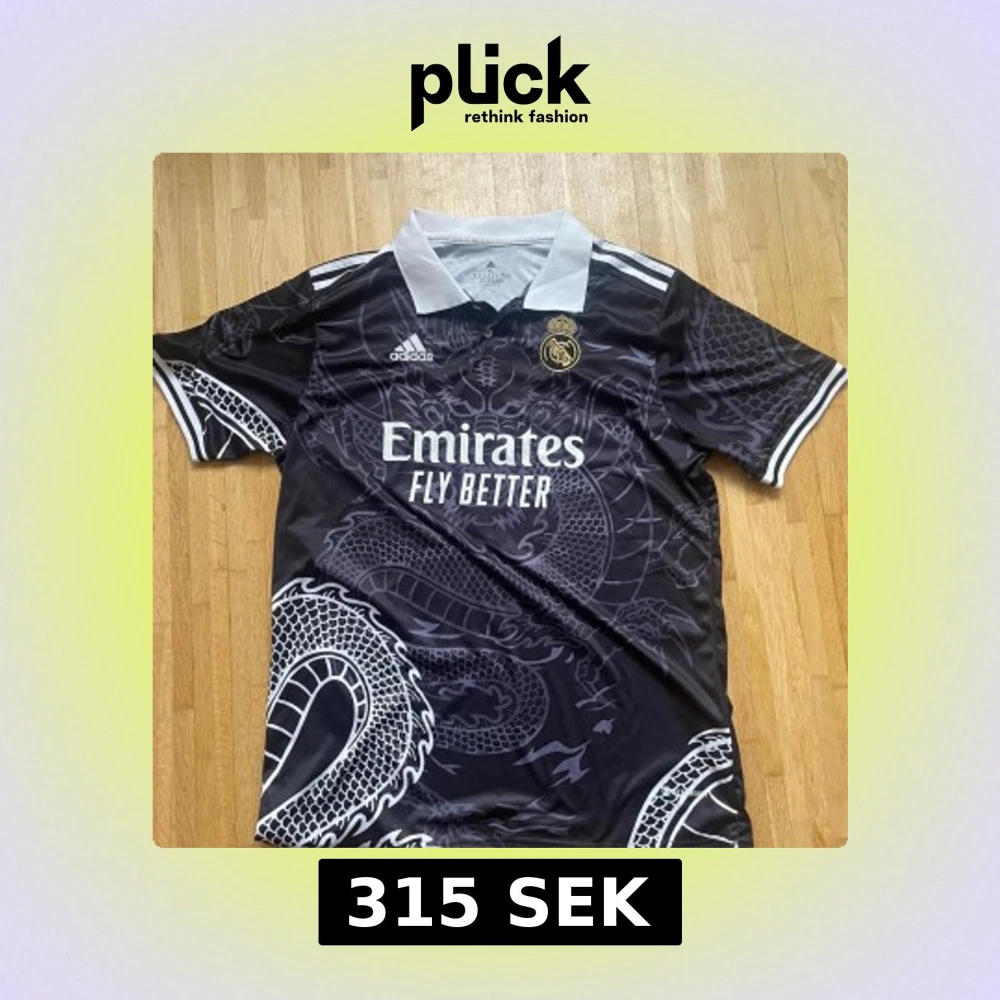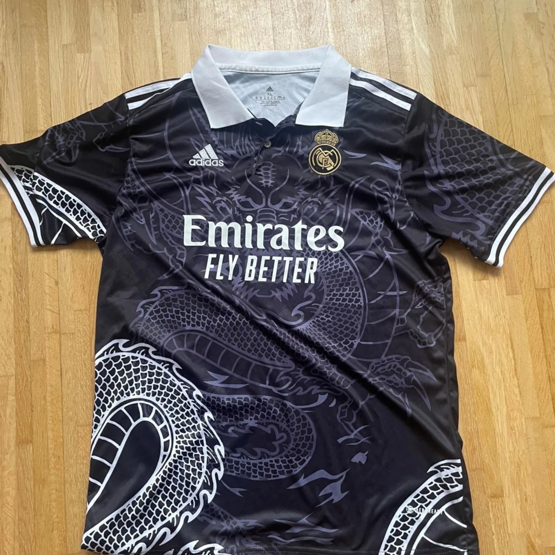 Snygg svart Real Madrid fotbollströja från Adidas med vit krage och detaljer. Tröjan har ett stort drakmönster över hela framsidan och baksidan, samt klubbmärke och sponsortryck på bröstet. Kortärmad och tillverkad i lätt polyester som andas.