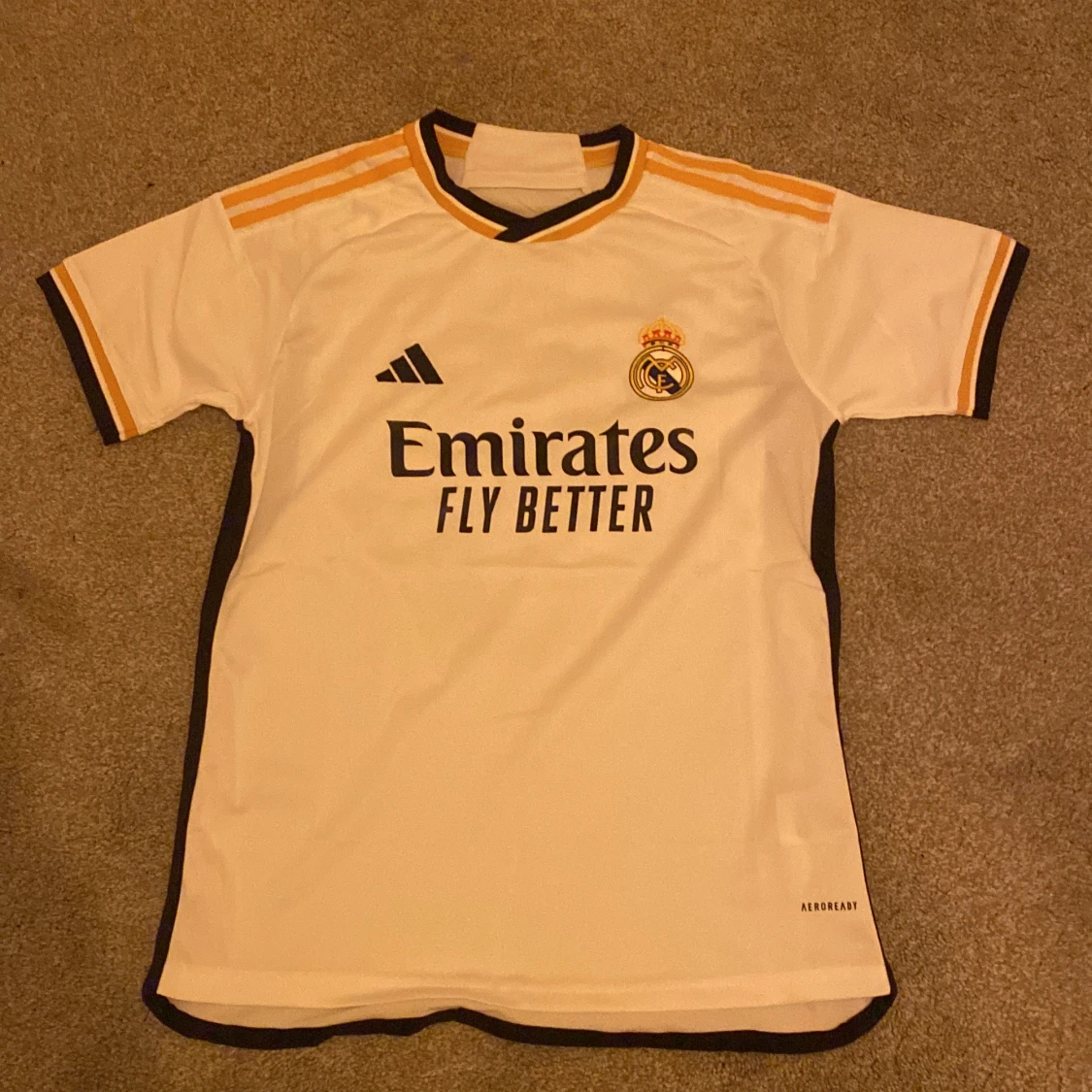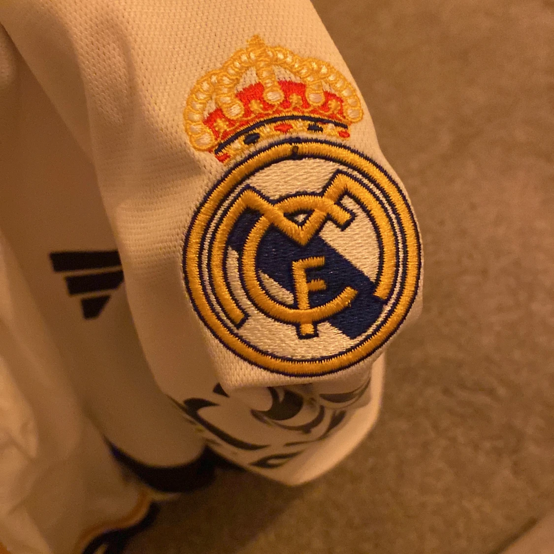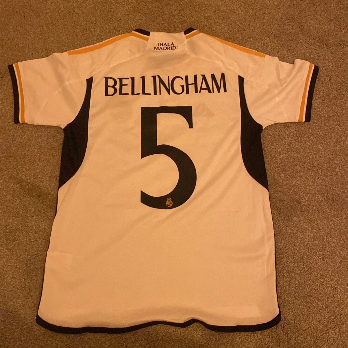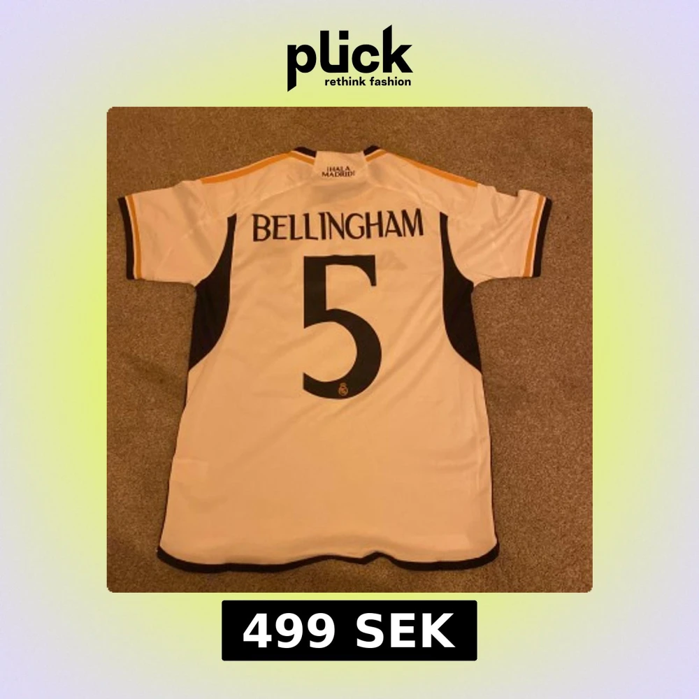 Säljer en vit Real Madrid fotbollströja från Adidas med Bellingham och nummer 5 på ryggen. Tröjan har svarta och gula detaljer samt klubbens emblem på bröstet. Perfekt för fans av laget! ⚽