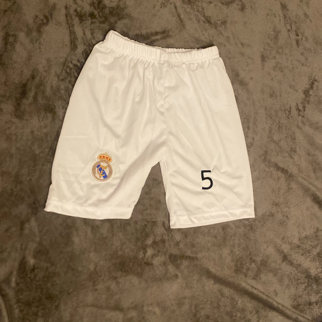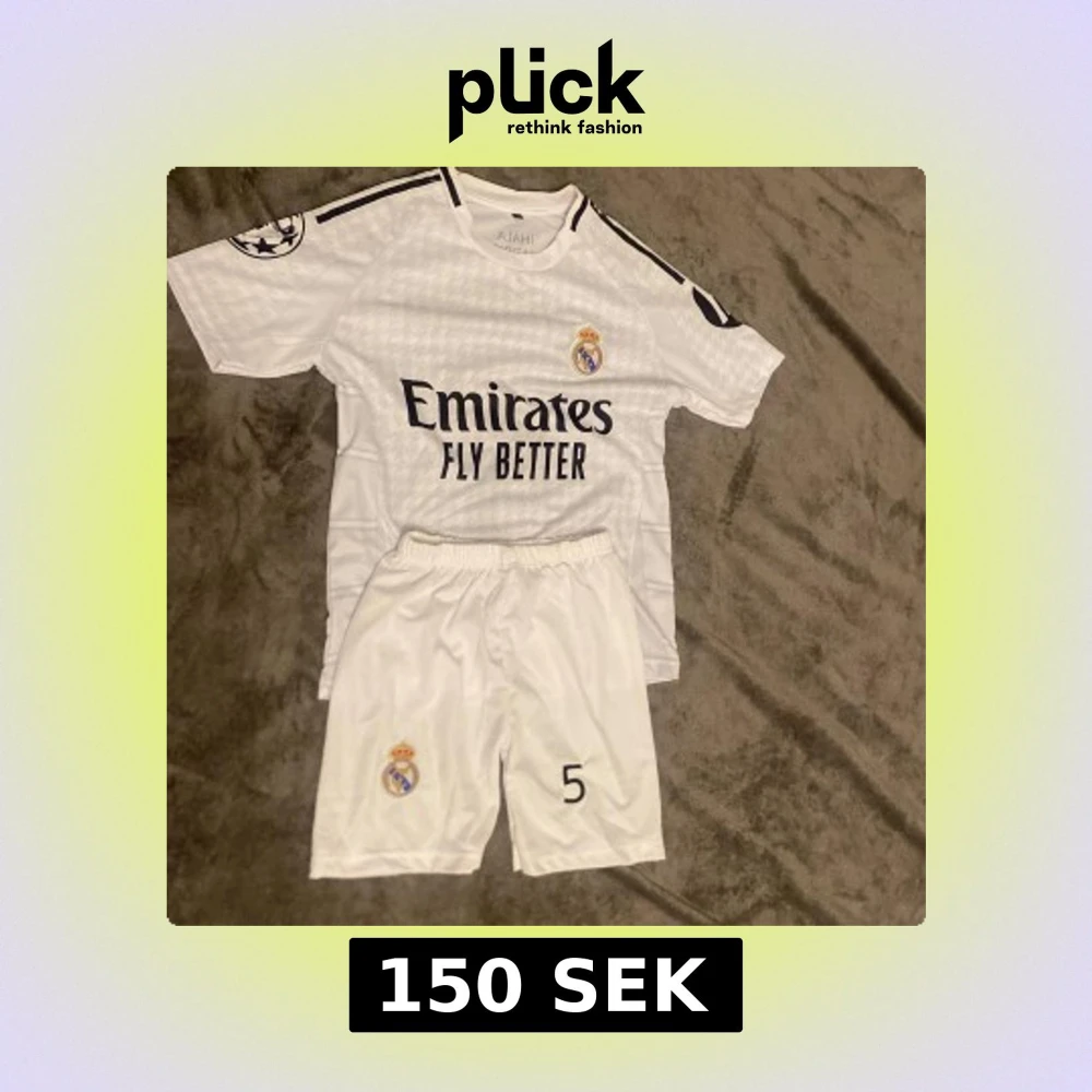 Säljer en vit Real Madrid fotbollströja med Bellingham och nummer 5 på ryggen. Tröjan har korta ärmar, svarta detaljer och klubbmärke på bröstet. Materialet är lätt och andas, perfekt för match eller träning. Ingår matchande shorts med klubbmärke och nummer 5.