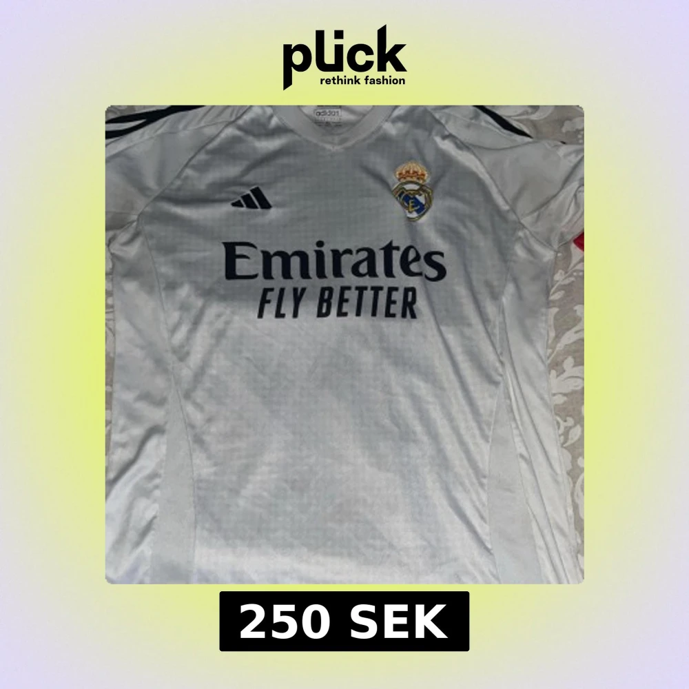 Säljer en vit Real Madrid fotbollströja från Adidas med Vini Jr. och nummer 7 på ryggen. Tröjan har korta ärmar, klubbmärke på bröstet och sponsortryck 'Emirates Fly Better' framtill. Materialet är lätt och andas, perfekt för match eller träning. Kan diskutera om priset!