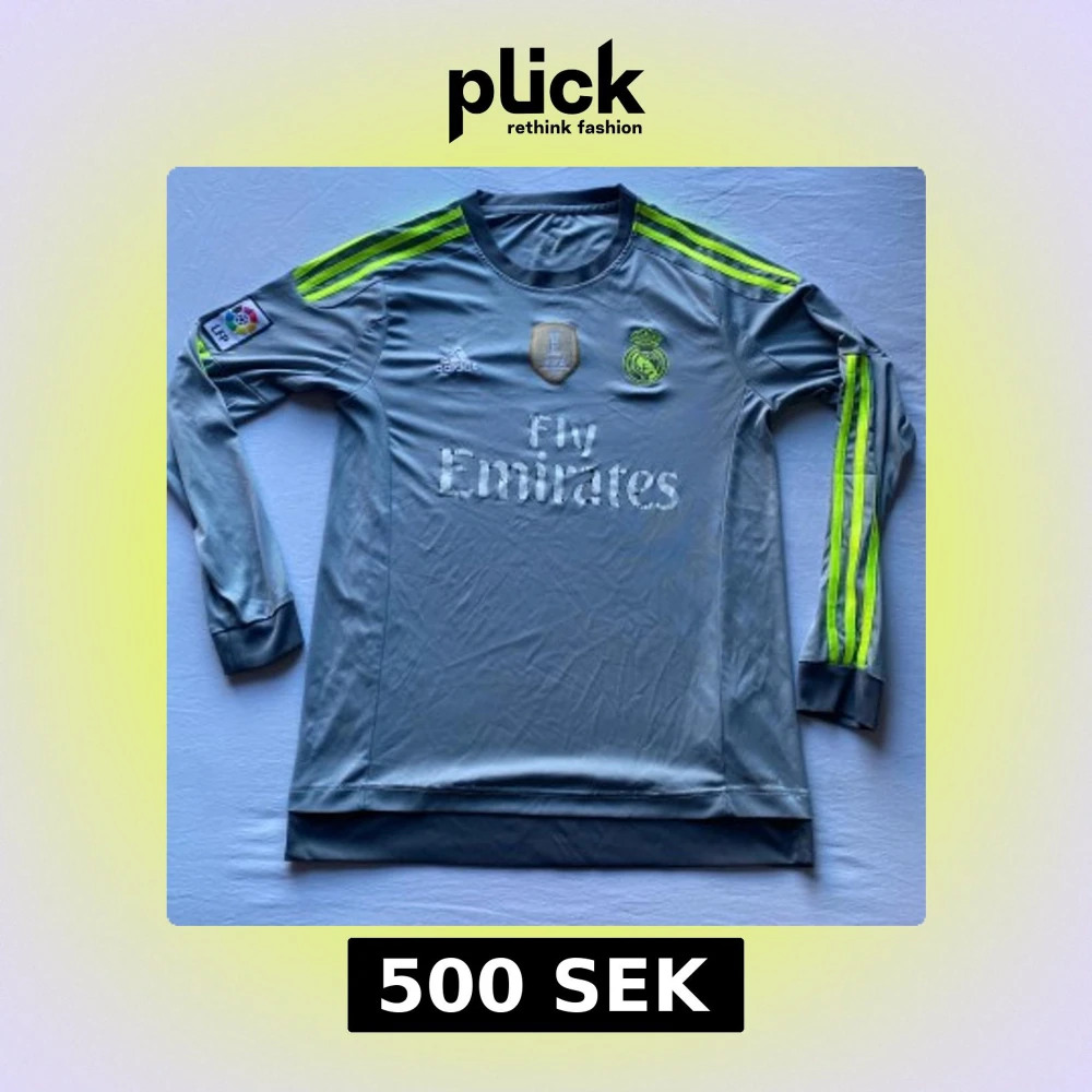 Snygg grå långärmad Real Madrid fotbollströja från Adidas med neongröna ränder längs ärmarna. Broderade klubb- och FIFA-märken på bröstet, samt Fly Emirates-tryck. Materialet är lätt och andas. Skriv om ni har några funderingar