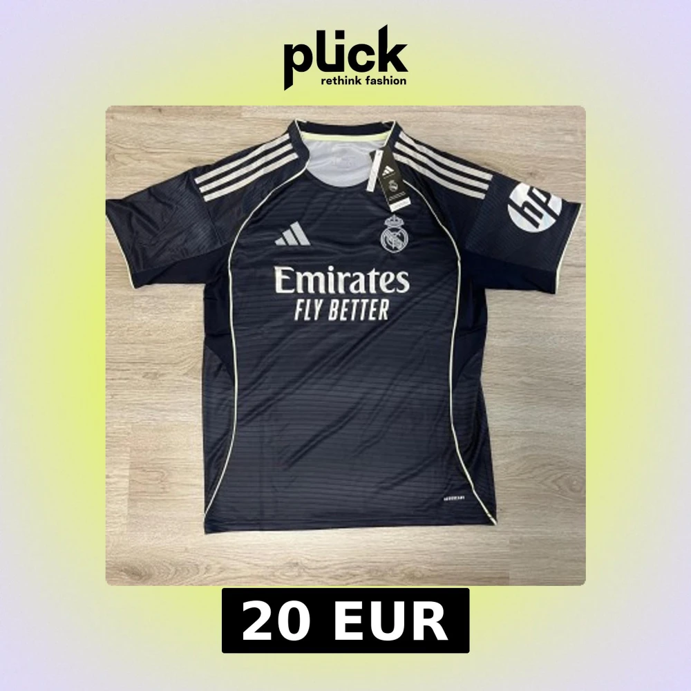Snygg Real Madrid fotbollströja från Adidas med silvriga detaljer och tunna ränder. Tröjan har korta ärmar, rund hals och tryck med Emirates Fly Better samt klubbmärke på bröstet. Tillverkad i lätt och ventilerande polyester.