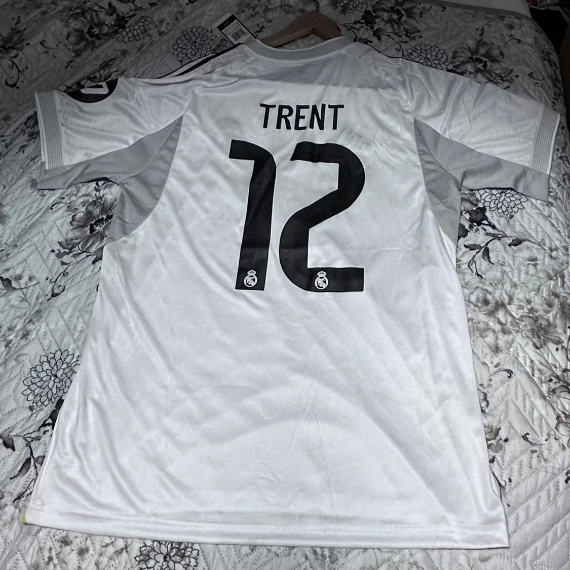 Splitterny Real Madrid matchtröja från Adidas i vitt med svarta detaljer och gula linjer. Tryck med 'Emirates Fly Better' på bröstet, klubbmärke och nummer 12 med namnet Trent på ryggen. Kortärmad modell i lätt och ventilerande material.