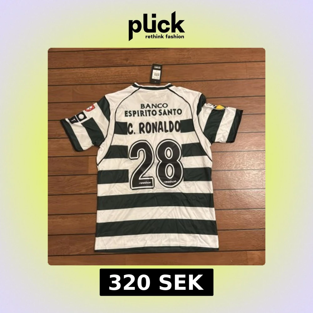 Säljer en officiell Sporting CP fotbollströja från Reebok i storlek L, med C. Ronaldo och nummer 28 på ryggen. Tröjan har breda gröna och vita ränder, klubbmärke på bröstet och sponsorer på ärmarna. Tillverkad i lätt polyester, perfekt för match eller samling.