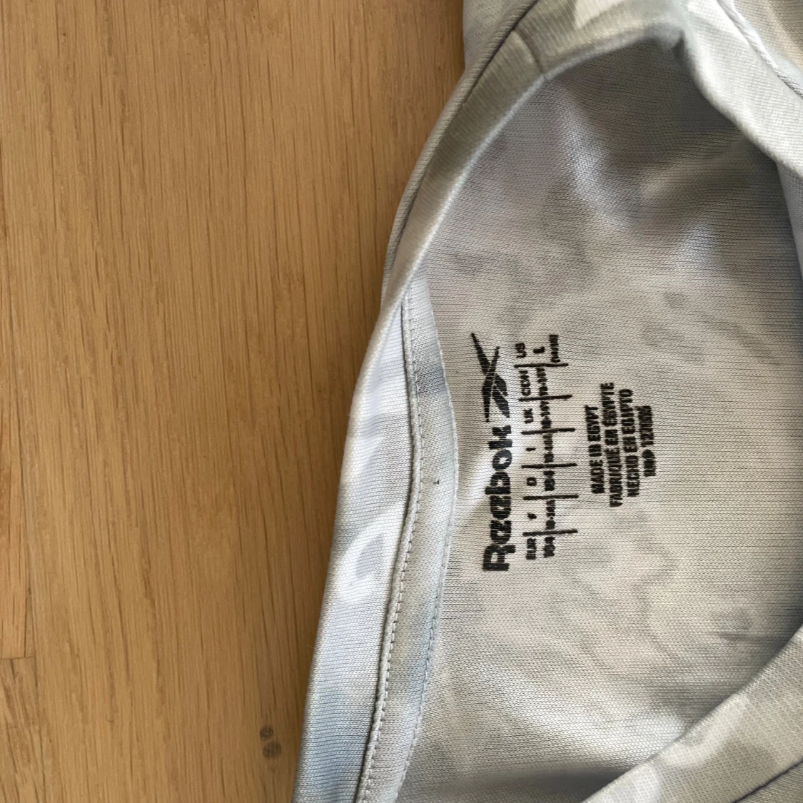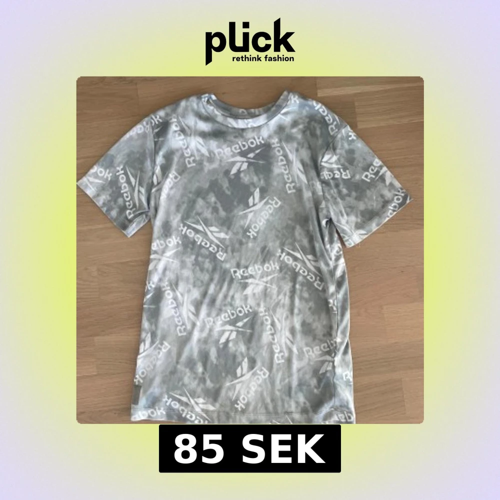 Snygg grå t-shirt från Reebok med coolt mönster och logga tryckt över hela plagget. T-shirten har rund hals och korta ärmar, perfekt för dig som gillar sportig stil. Materialet är mjukt polyester som känns skönt mot huden.