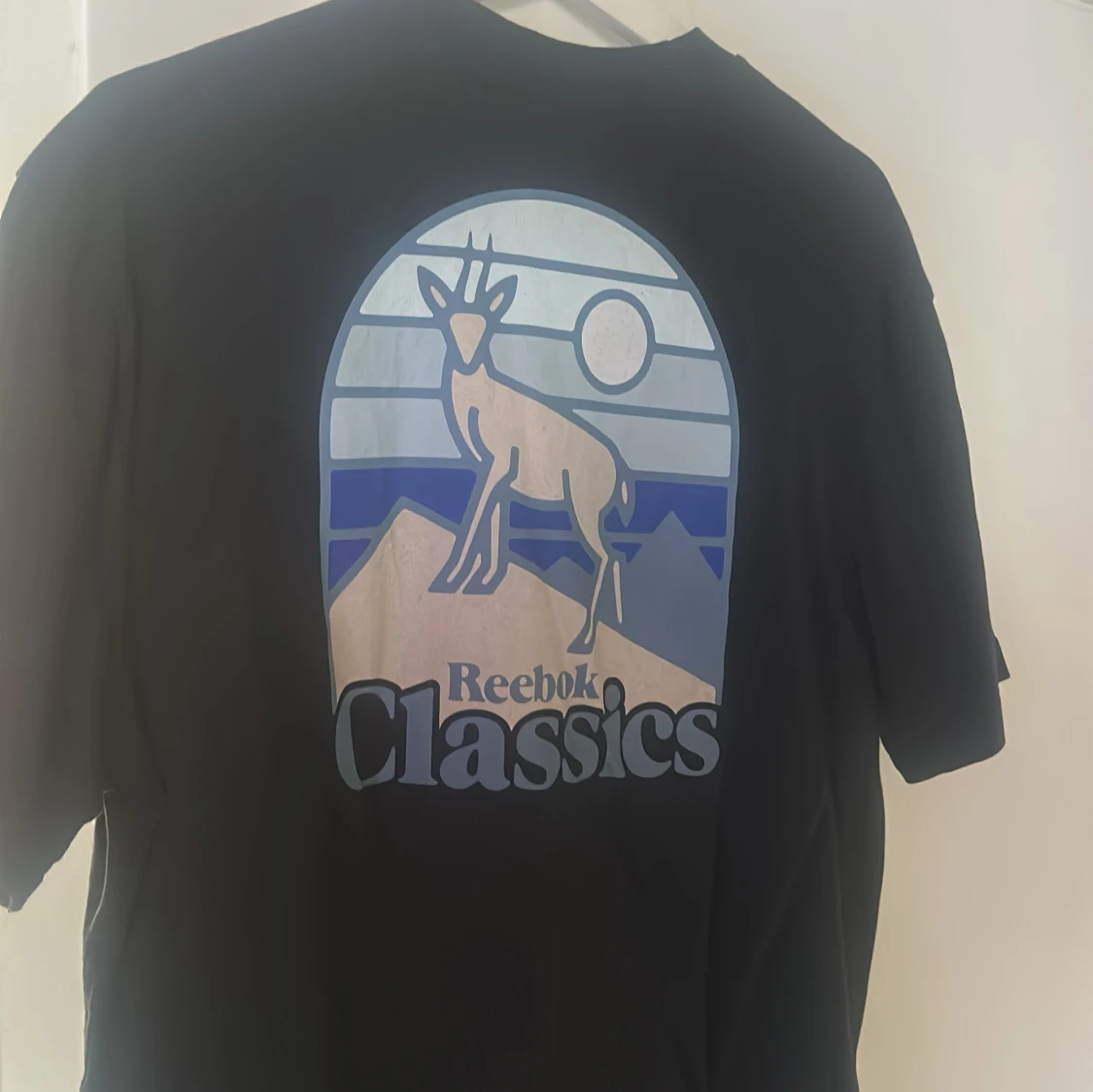 Reebok t shirt, strl L, svart med blått tryck. Som ny
