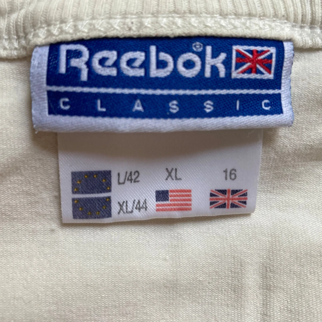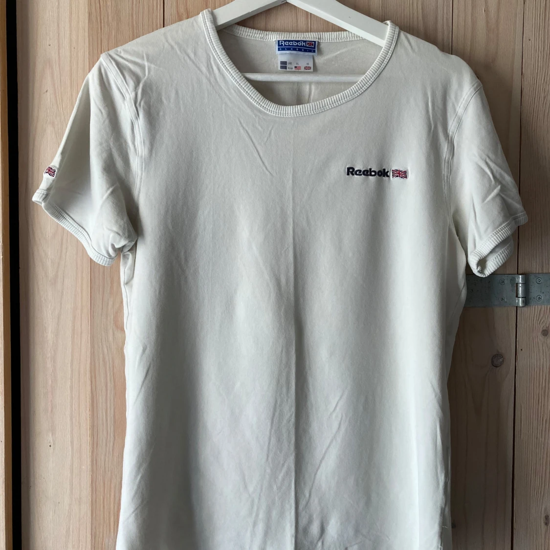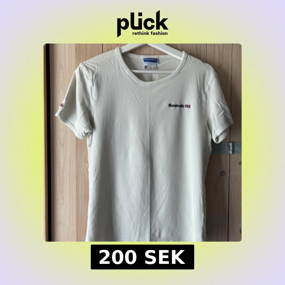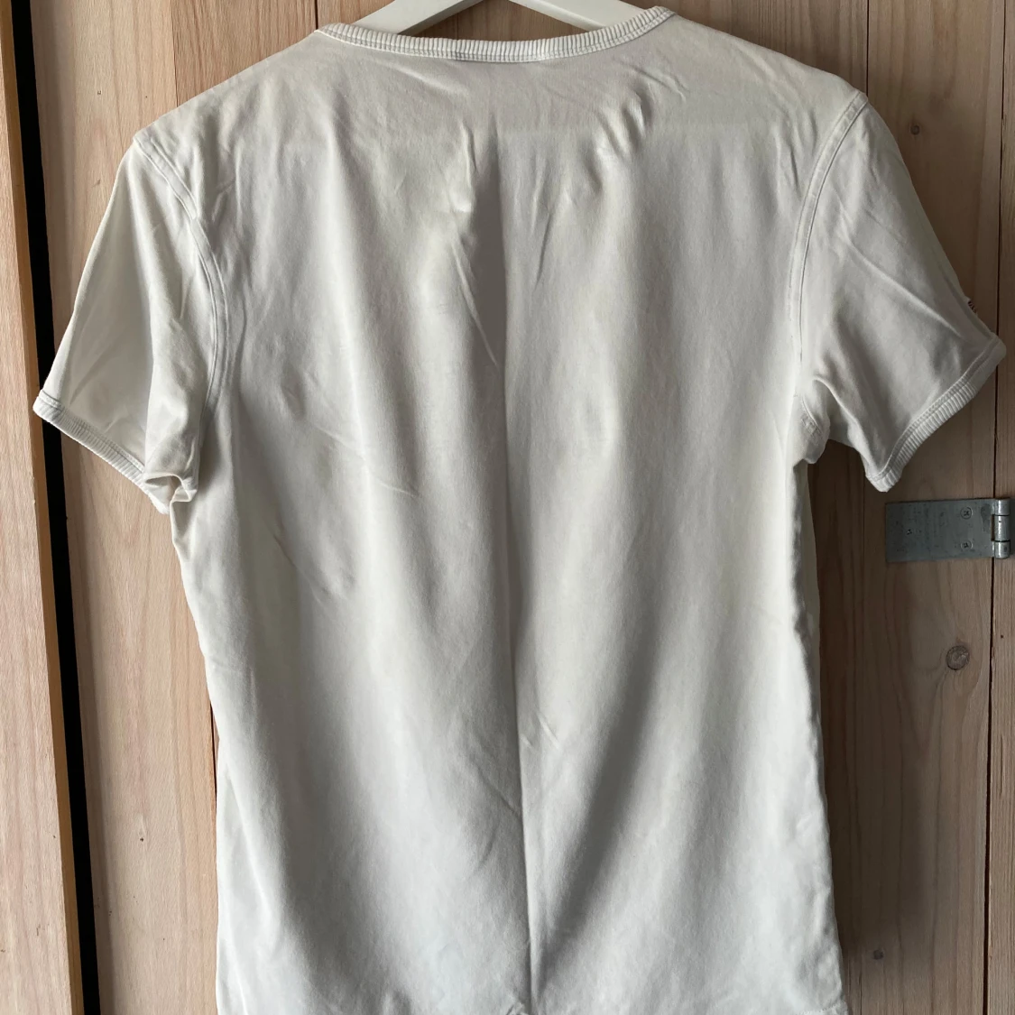 Riktigt skön modell med stretch; 92% bomull och 8% elastan. Perfekt skick, vit med nyansen ”gammaldags vanilj”. Det är juniorstorlek men den funkar utmärkt för vuxen. Måtten är 86 cm bröstvidd och 61 cm längd vilket motsvarar vuxenstorlek S. Jag har L och har inga problem att få på mig denna, men självklart blir den då spännig. Så skulle säga att den även kan passera som M, med tanke på stretchen. Är du rippad är denna t-shirt en dröm. Upphämtning i Stockholm fungerar.