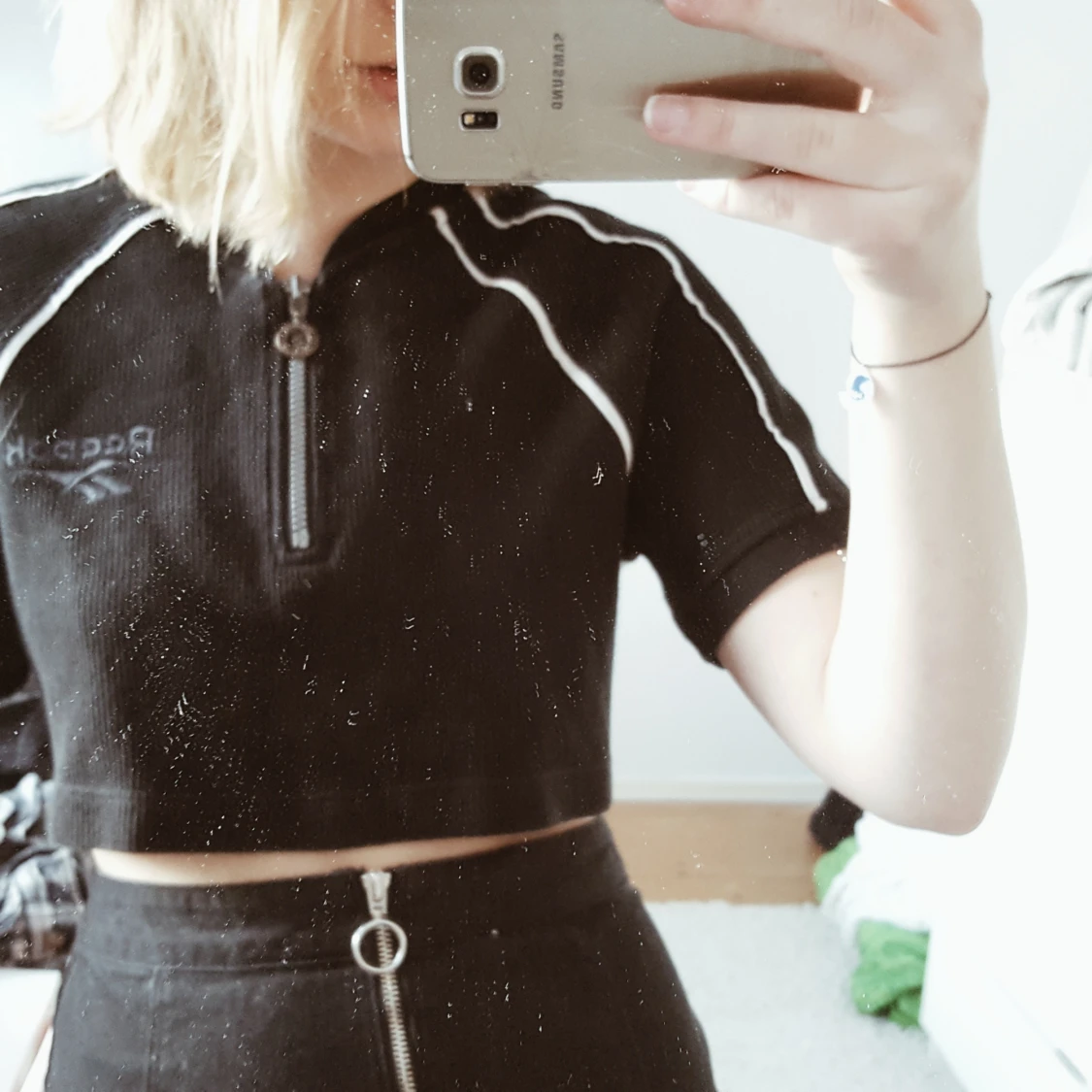 coolaste retro reebok tröjan! kort och sportig, mönster på baksidan också. jag har small i tröjor och den sitter väldigt löst och rymligt så skulle säga xs till stor m. köpt second hand i lund, adrig använd :)