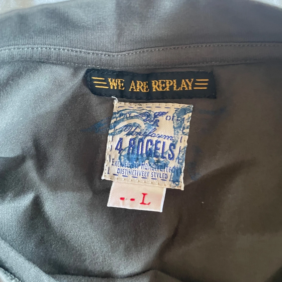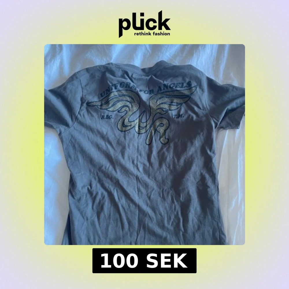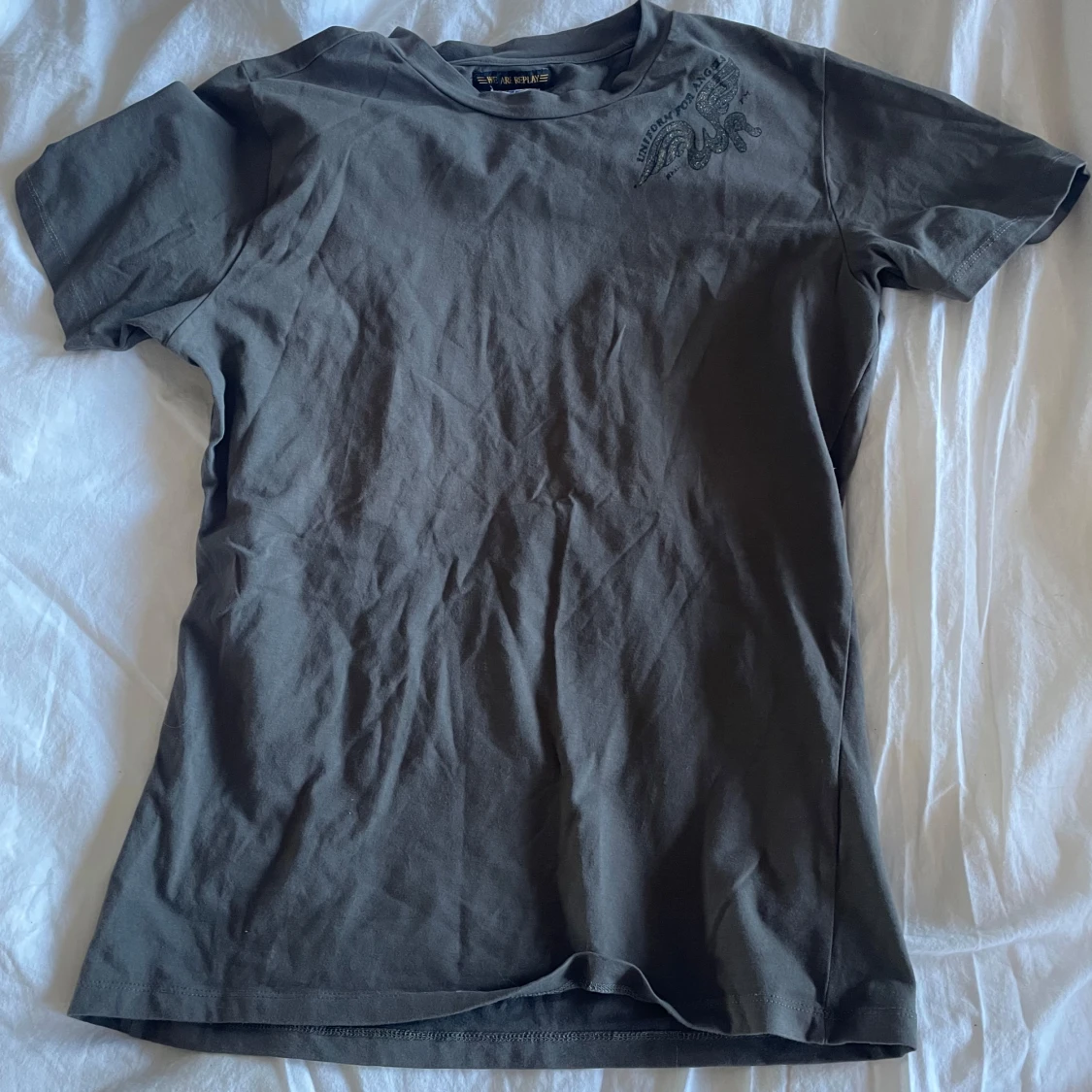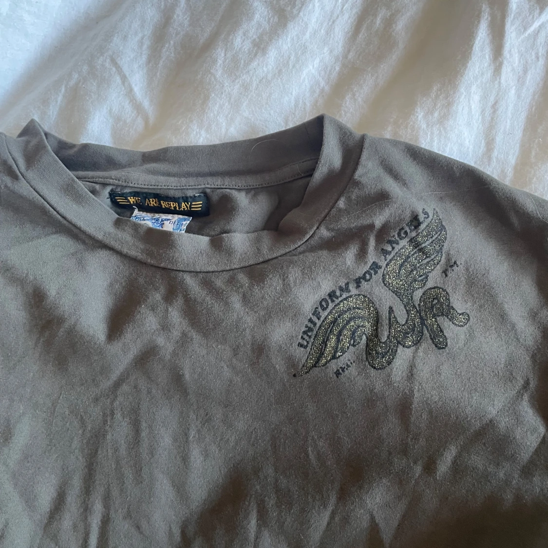 Säljer en grå t-shirt från Replay med tryck 'Uniform for Angels' och vingmotiv på både fram- och baksidan. T-shirten har en normal passform och är kortärmad. Perfekt för en avslappnad stil.